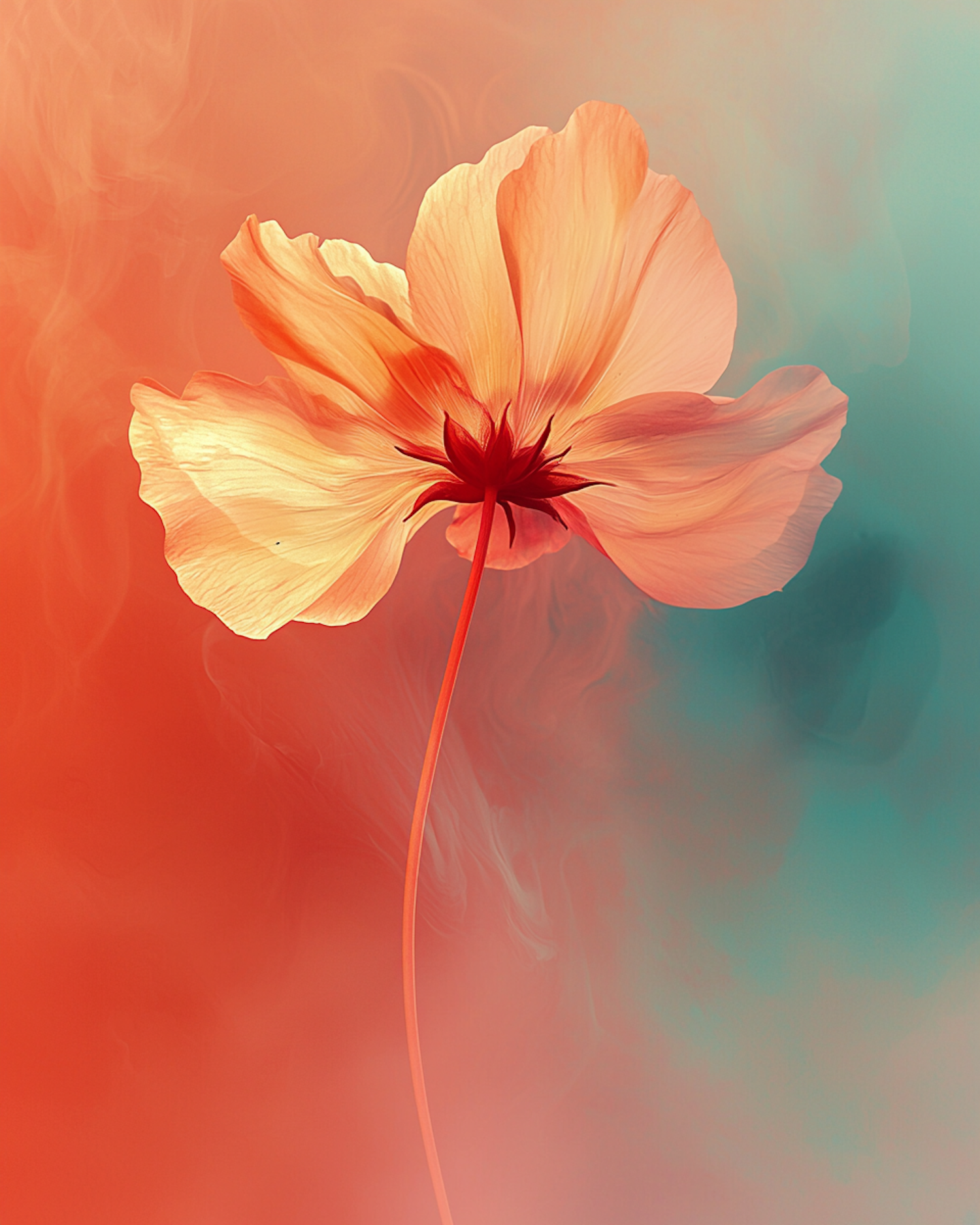 A glowing peach and cream flower with a red base set against a dreamy orange and teal gradient background with smoky textures.