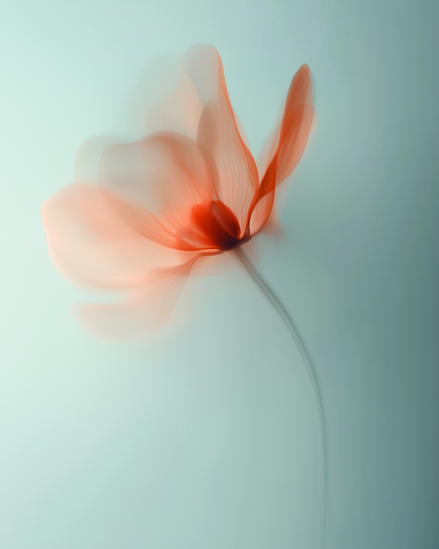 Abstract flower with translucent orange petals on a mint-green background, creating a serene and ethereal visual effect.