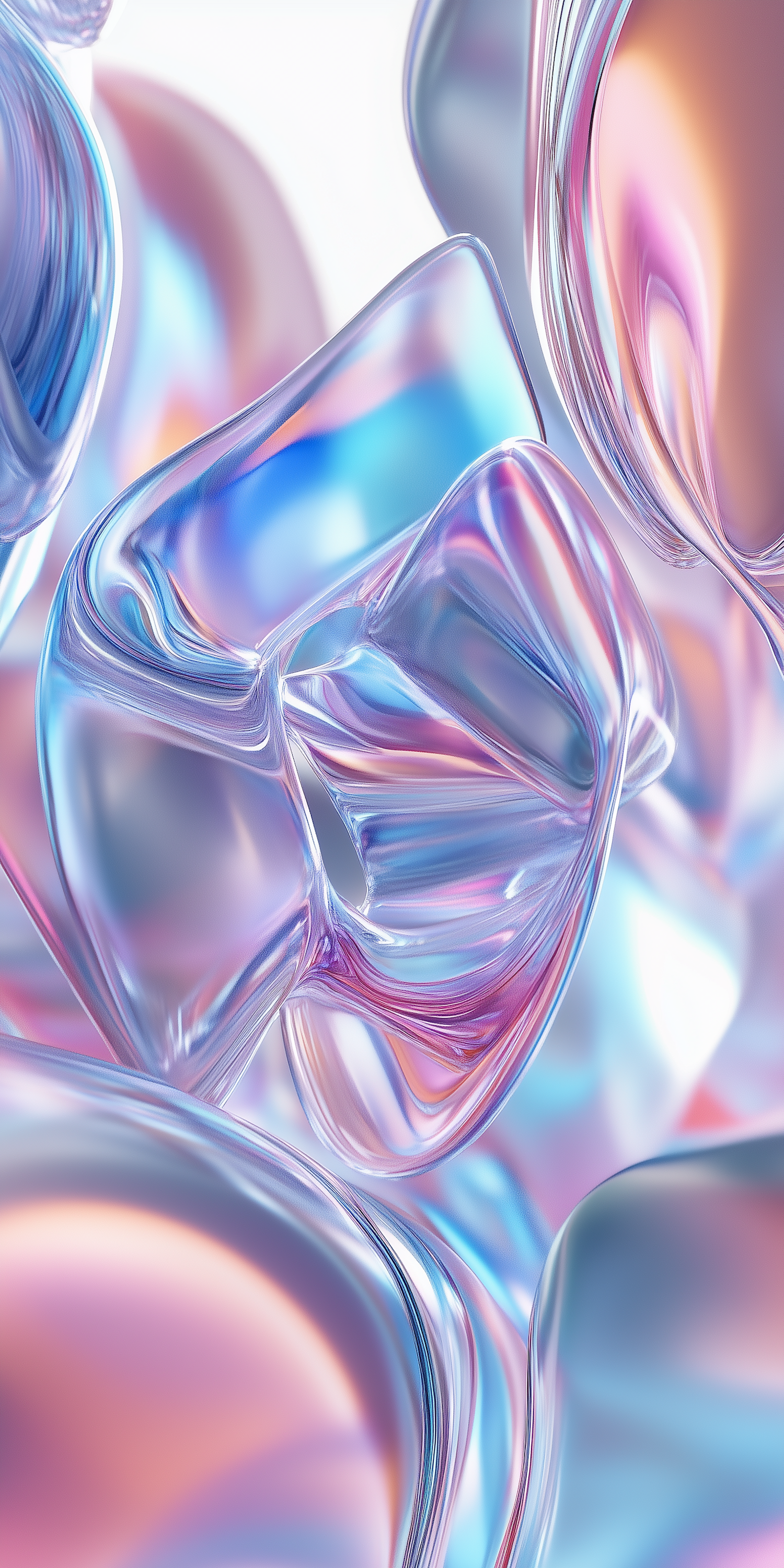 Abstract fluid shapes with pastel hues of pink, blue, and lavender, resembling flowing glass with reflective surfaces.