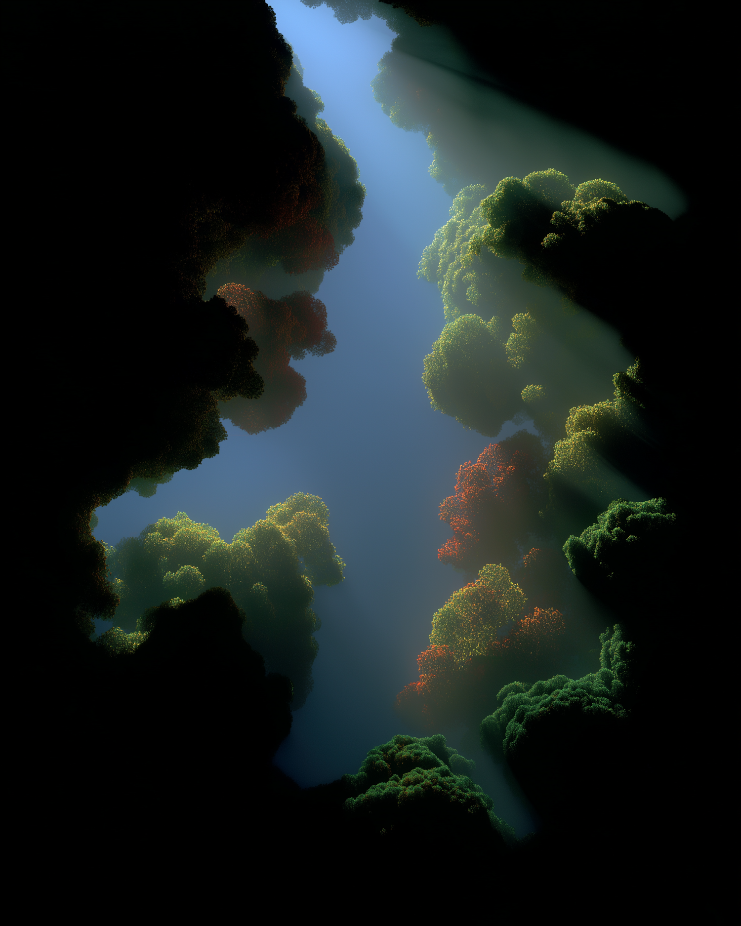 A surreal scene of vibrant, tree-like structures illuminated by beams of light in a dark, cavernous space, evoking depth and mystery.