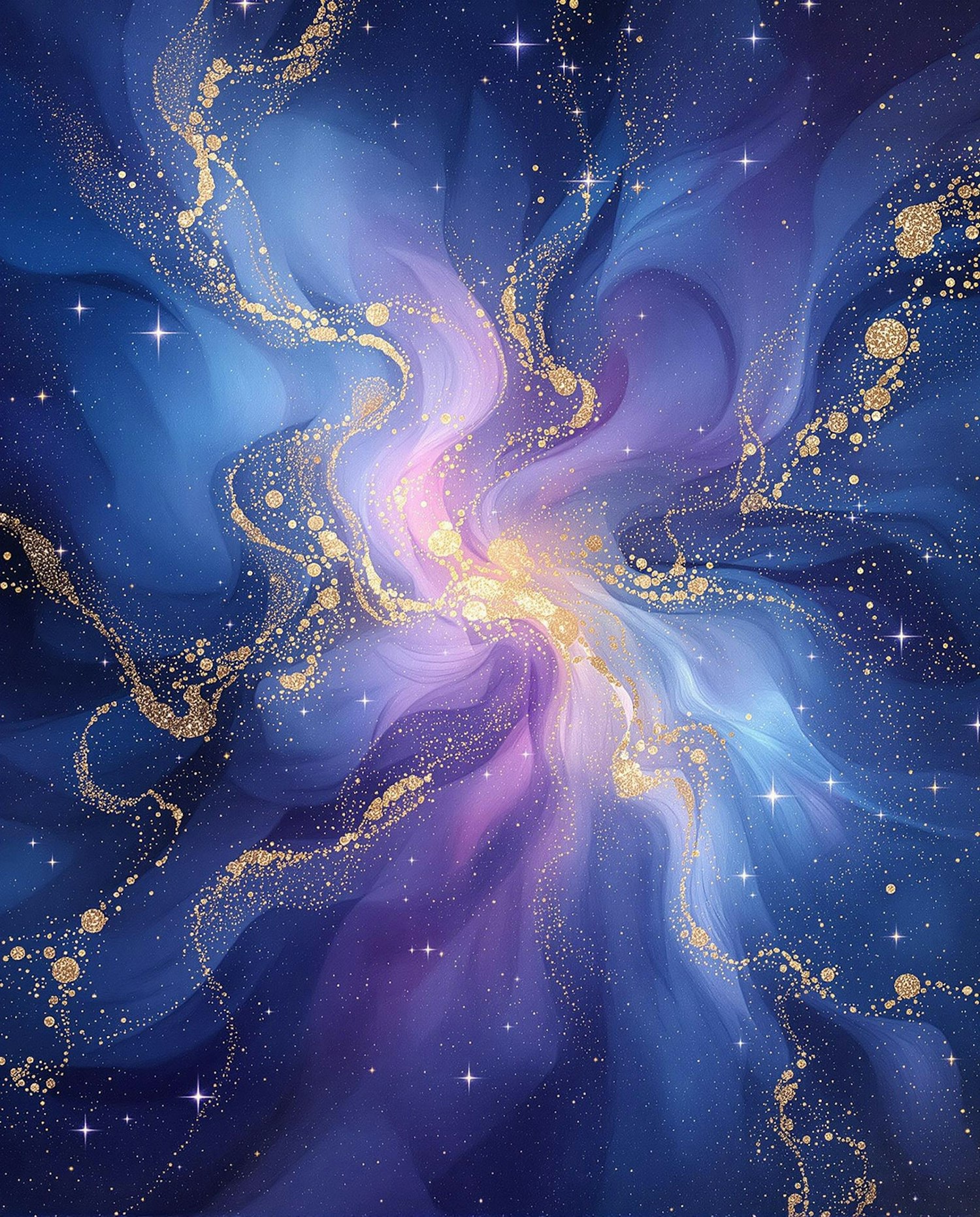 abstract nebula-inspired painting, swirls of deep blue, lilac, and gold, soft blending, cosmic energy, subtle gradients, dreamy atmosphere, high-resolution