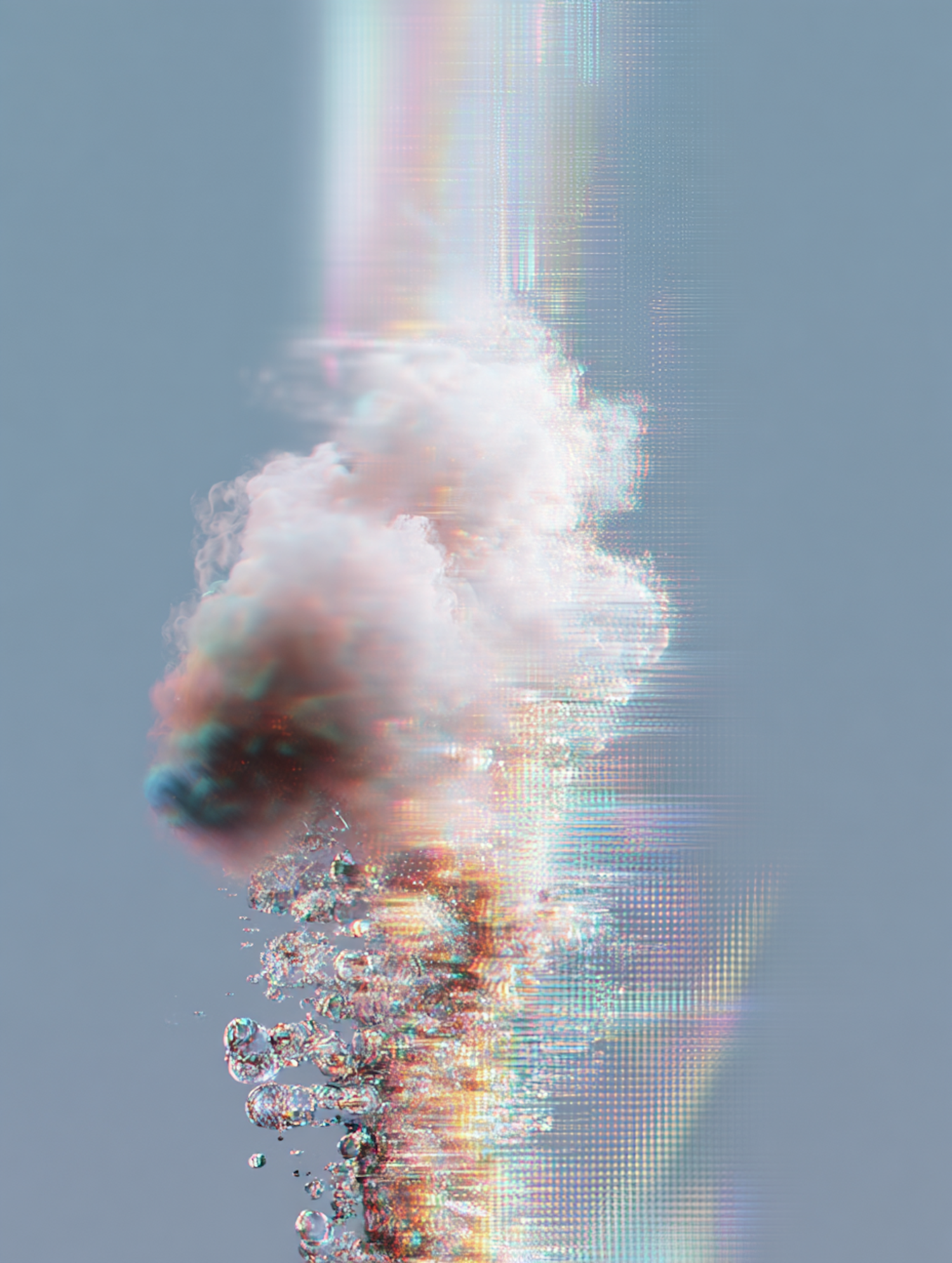 A surreal digital artwork blending a cloud with glitch effects and refracted light patterns against a light blue background.