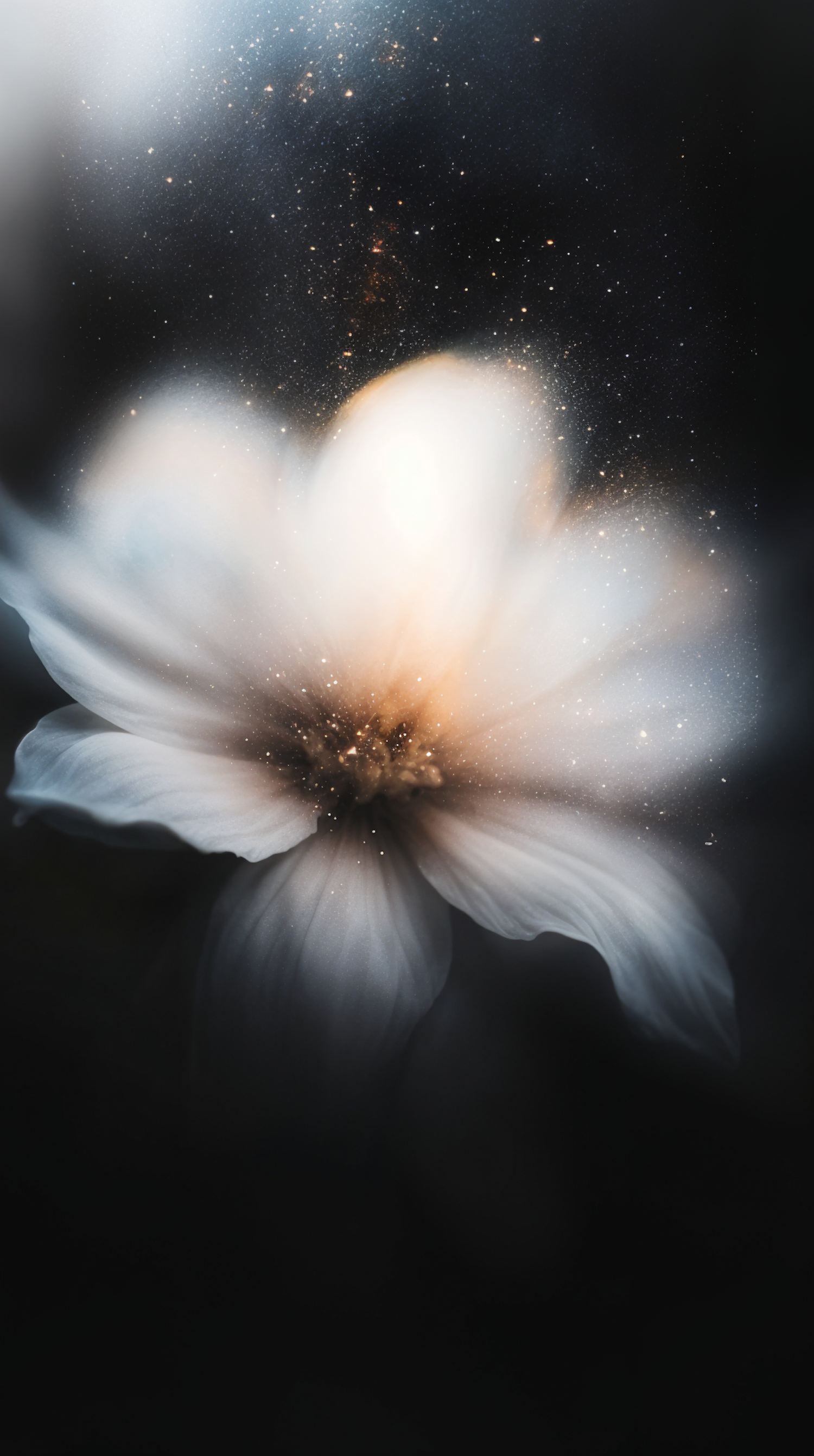 A glowing white flower with golden light and starry particles, creating a dreamy, celestial vibe against a dark background.