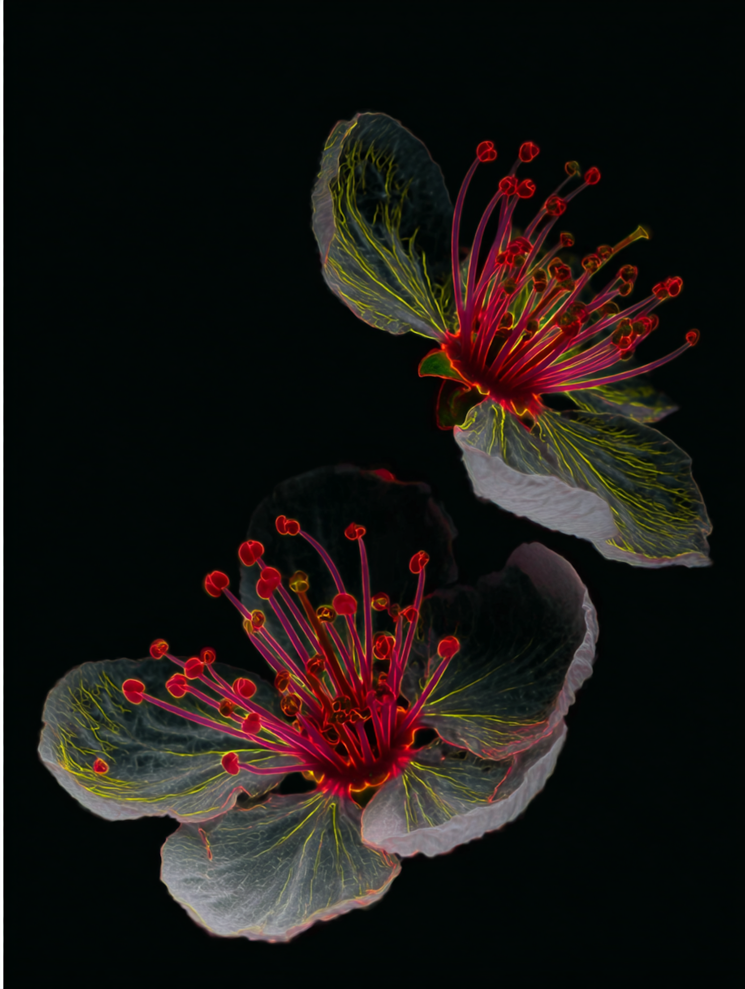 Stylized glowing flowers with vibrant red and yellow hues on a black background, showcasing intricate details and vivid contrasts.