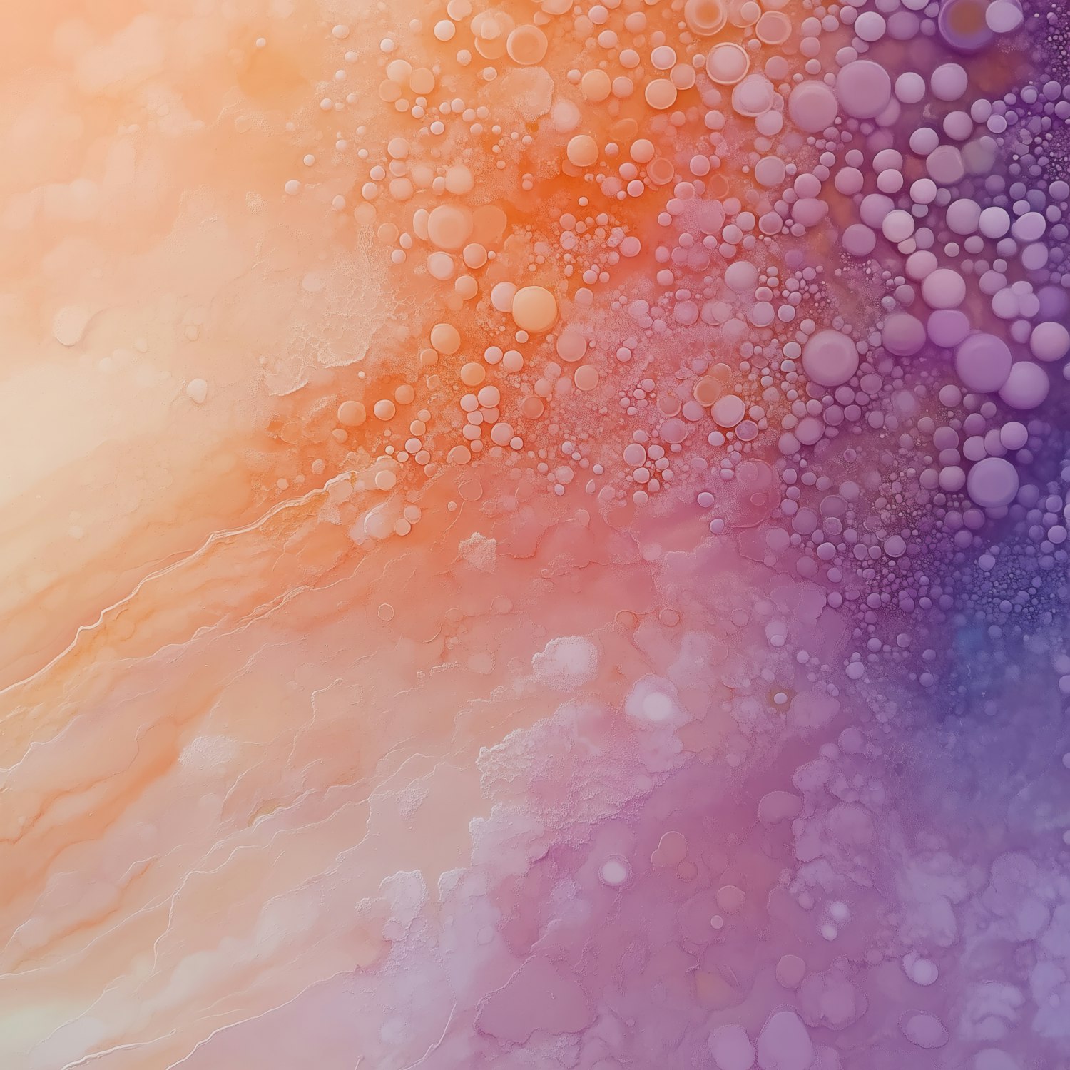 Abstract art with orange-to-purple gradient, textured bubbles, and a marbled background. Dreamy and vibrant with a fluid, dynamic feel.