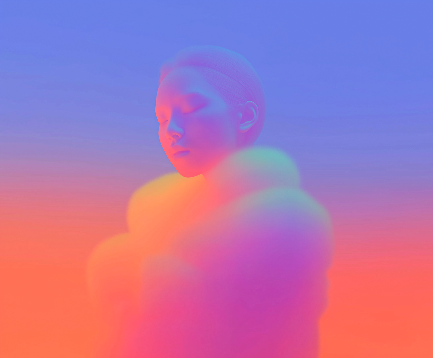 A serene digital artwork of a face surrounded by vibrant, dreamy gradients blending warm and cool tones, evoking a tranquil atmosphere.