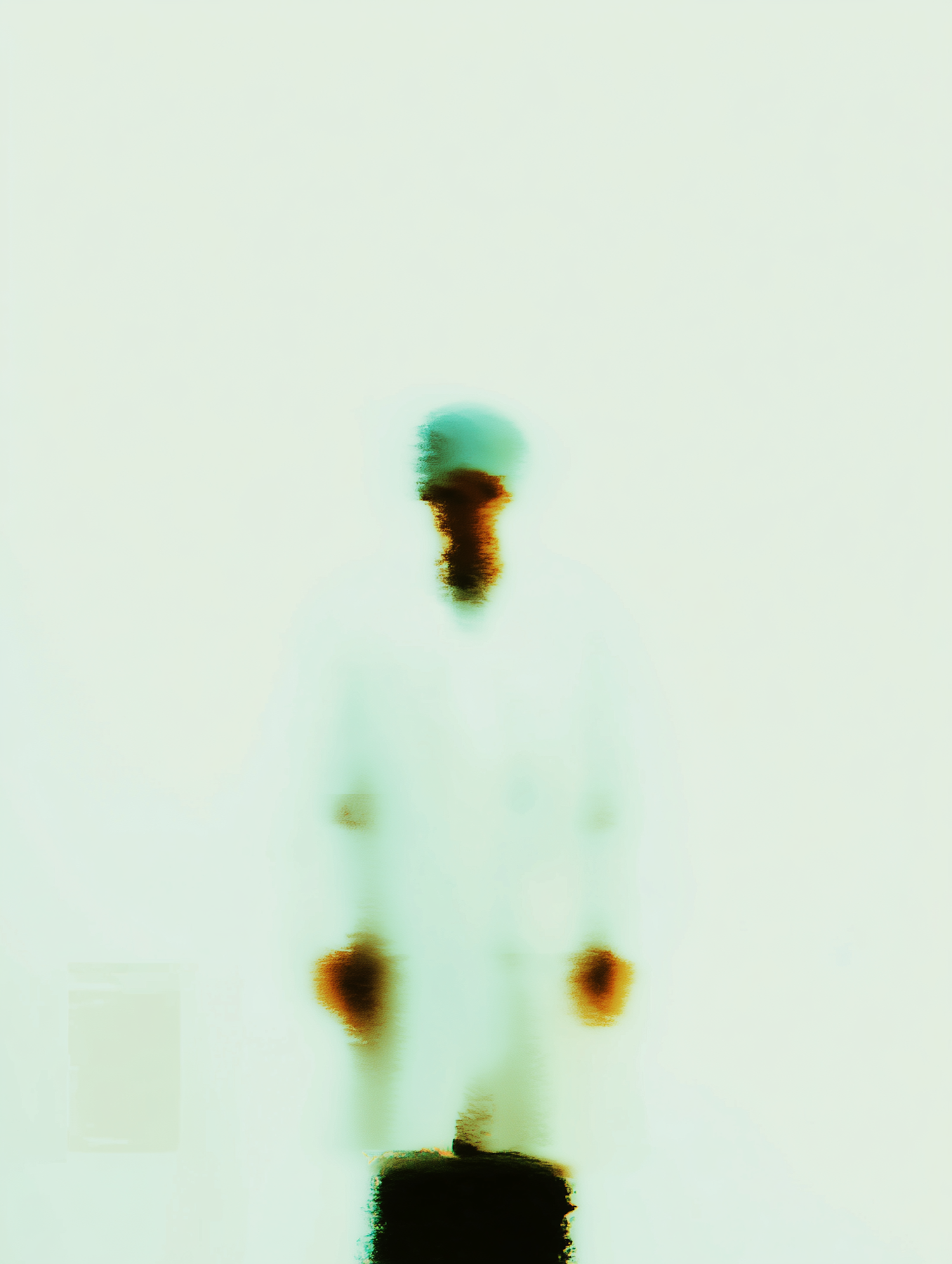 Abstract depiction of a human figure in a blurred, ethereal style against a pale background, evoking mystery and ambiguity.