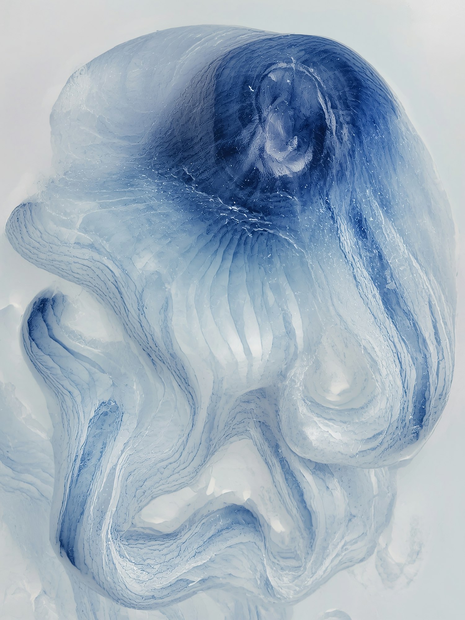 Abstract image of a translucent, flowing form in shades of blue and white, resembling a jellyfish or ethereal structure.