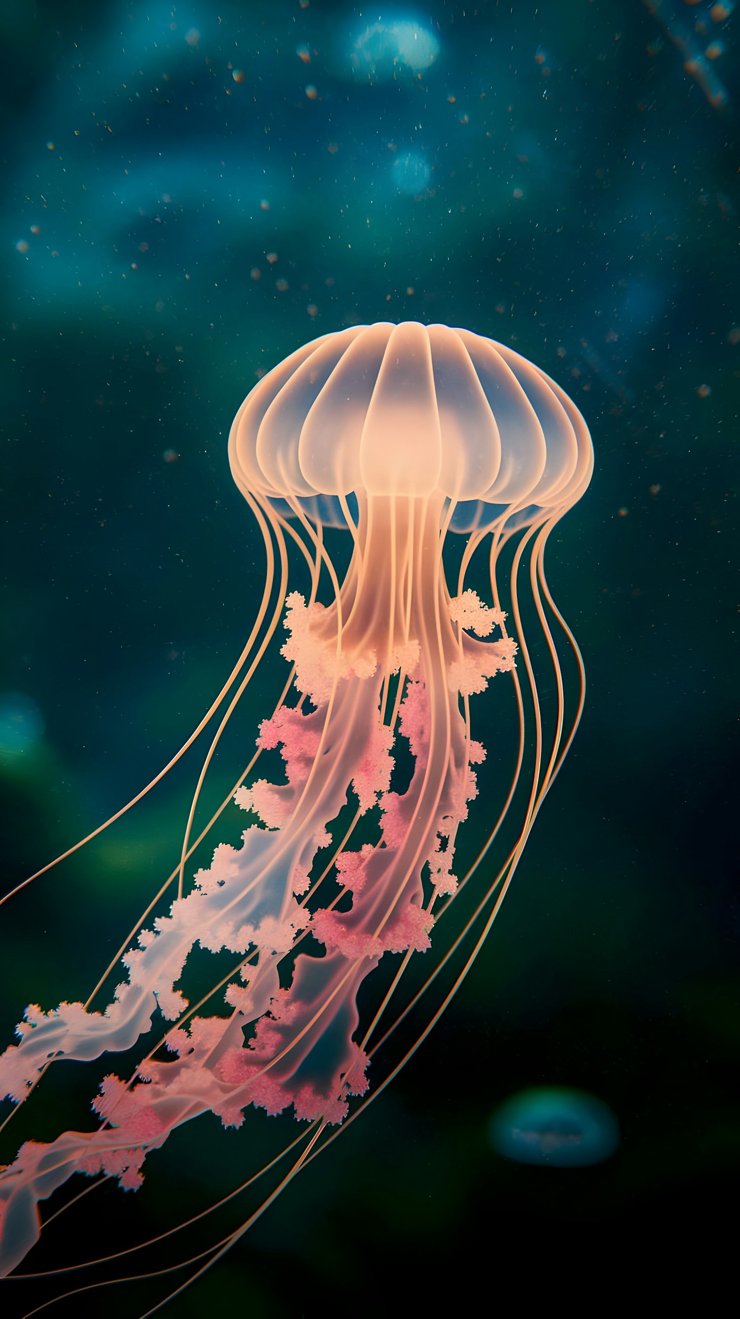 A glowing jellyfish with peach and pink hues drifts in a serene, deep teal ocean, its delicate tentacles trailing gracefully.