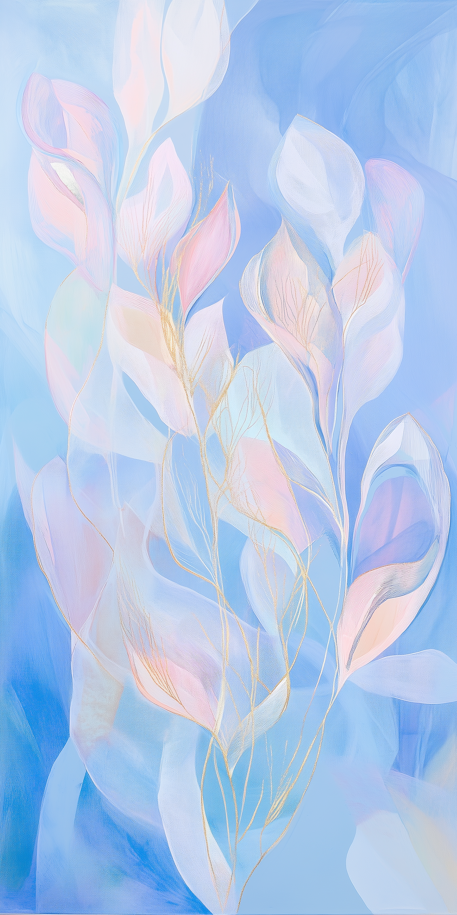 Ethereal pastel leaves with golden veins on a soft blue background, creating a dreamy and tranquil abstract illustration.