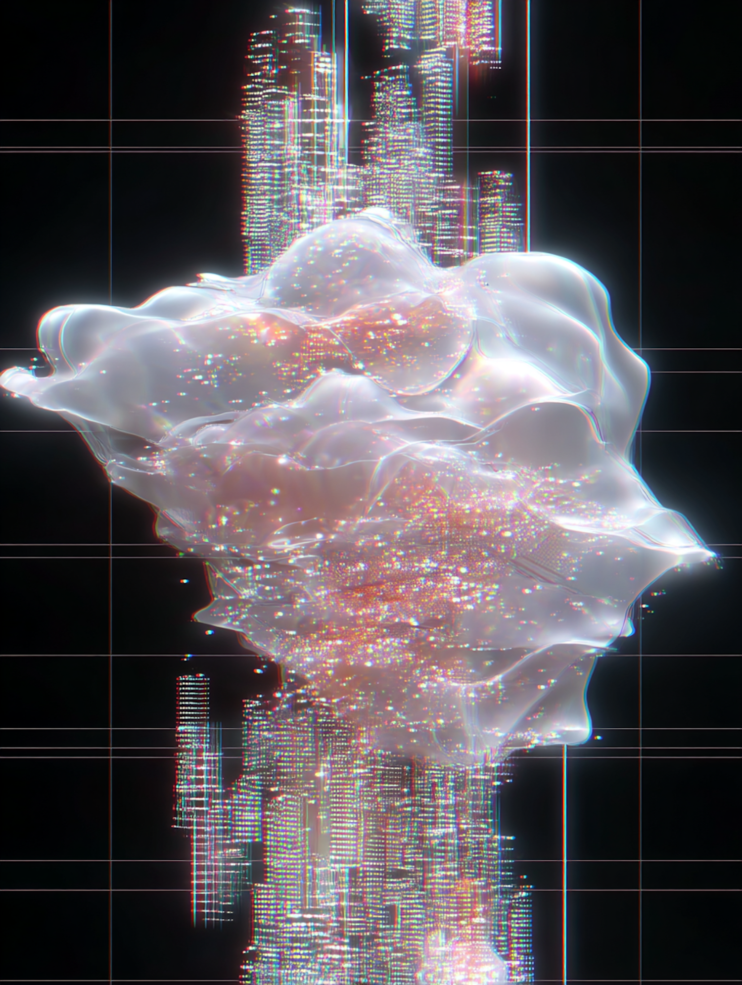 A stunning digital artwork of a glowing, translucent cloud-like structure with vibrant lights against a dark, grid-patterned background.