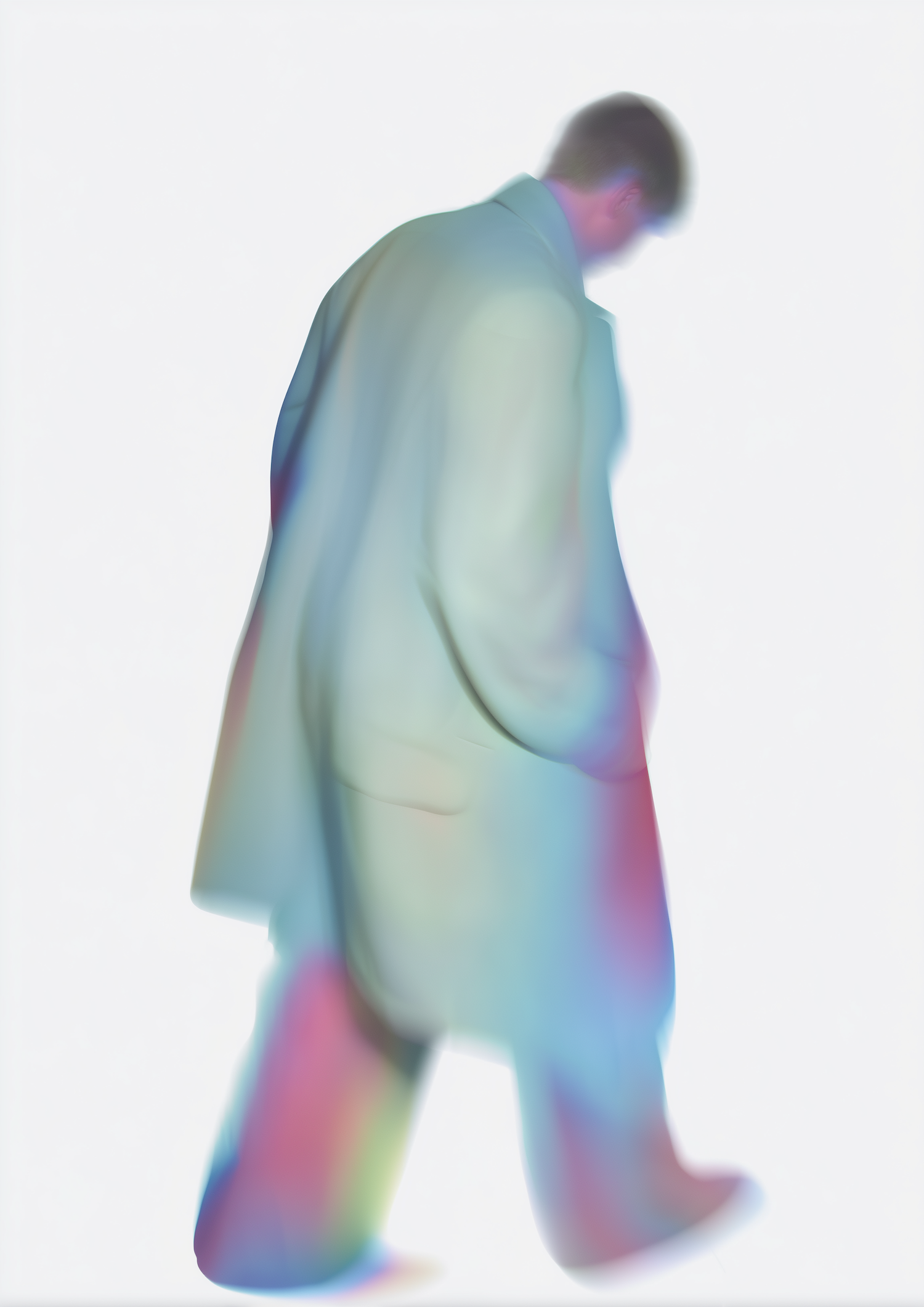 A blurred, colorful depiction of a person in motion, with vibrant gradients and a clean white background.