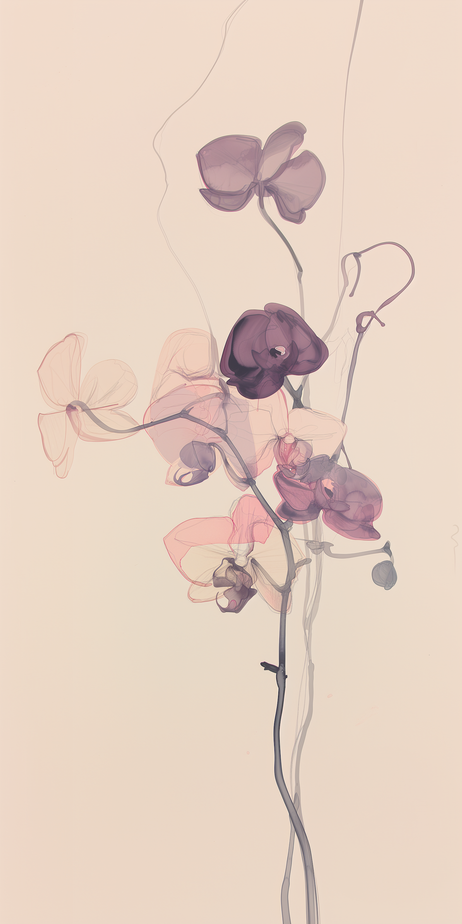 Elegant illustration of translucent orchids in purple and pink on a beige background, showcasing delicate beauty and fluidity.