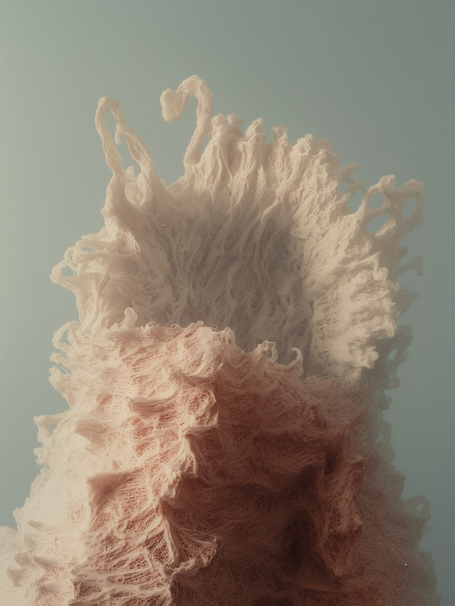 Abstract fibrous structure with intricate textures in pastel tones against a muted blue background, evoking a sense of organic elegance.