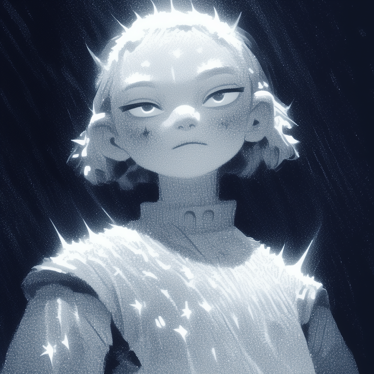 A luminous illustration of a serene figure with glowing hair and starry attire, set against a dark background for a celestial effect.