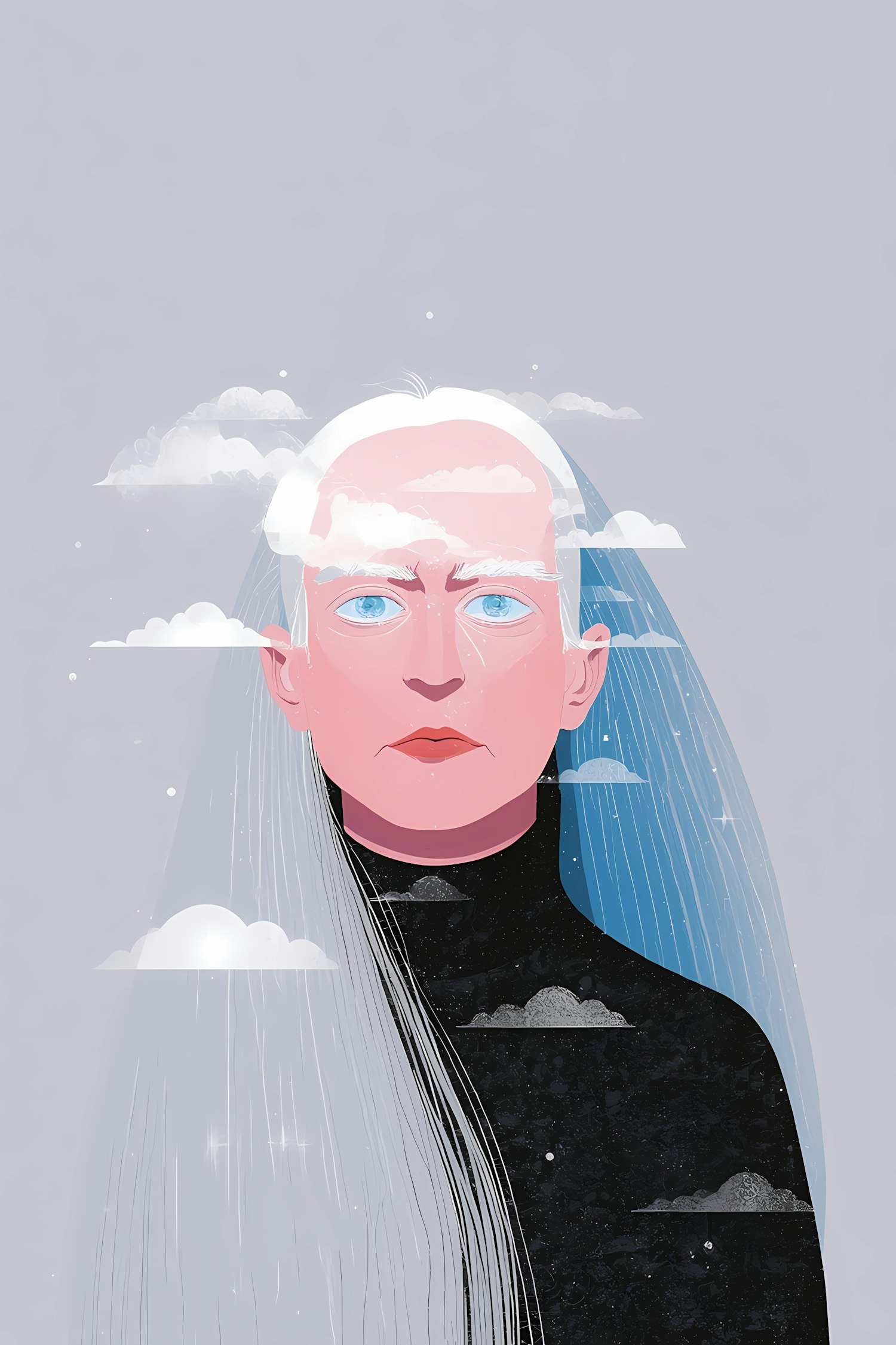 A surreal illustration of a person with white hair and clouds blending into their form, set against a soft gray background.