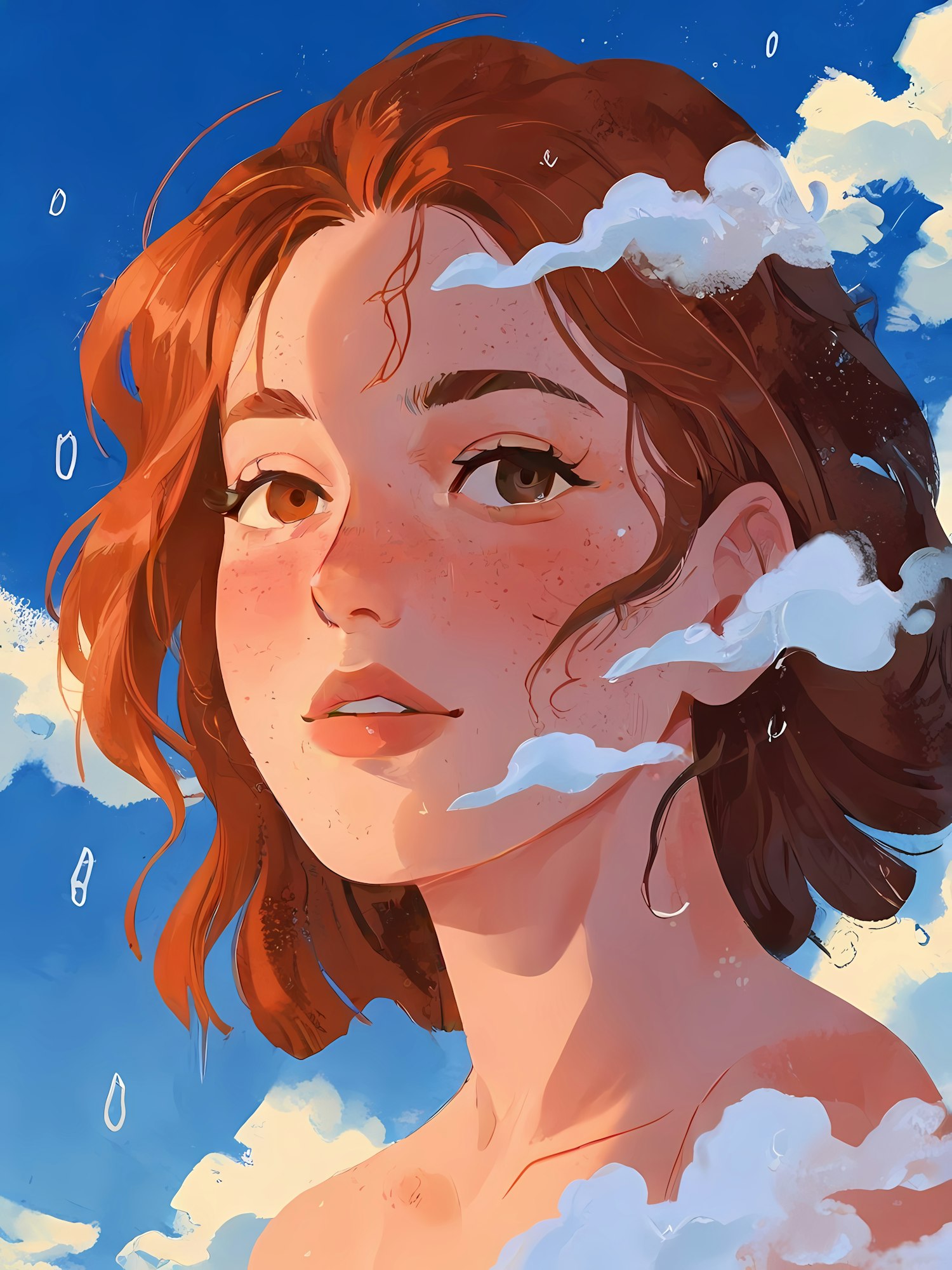 Ethereal illustration of a young woman with auburn hair and freckles, set against a vibrant blue sky with clouds.
