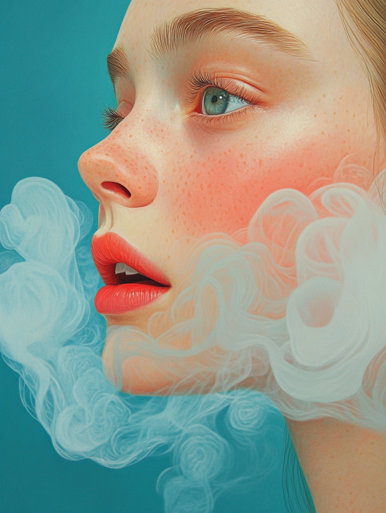 Ethereal illustration of a freckled woman with blue eyes and red lips, surrounded by swirling white smoke on a teal background.