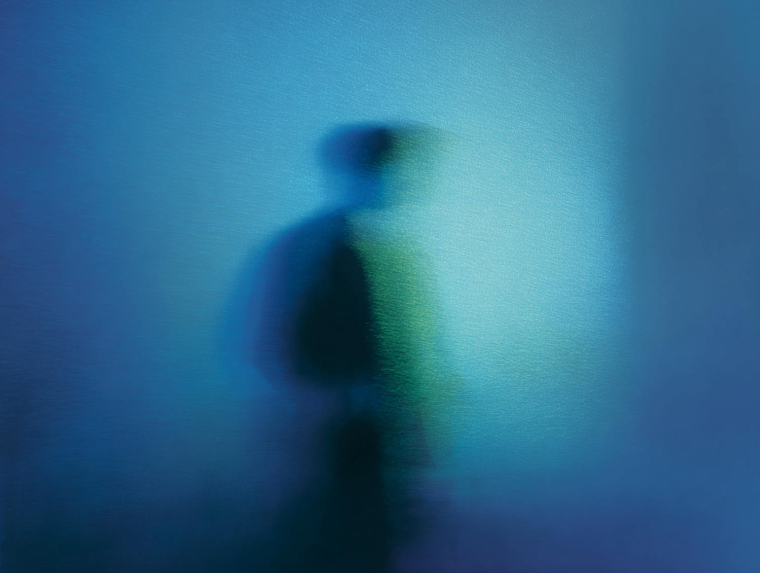 A blurred silhouette stands against a vibrant, atmospheric backdrop of blue and green tones, evoking a sense of mystery.