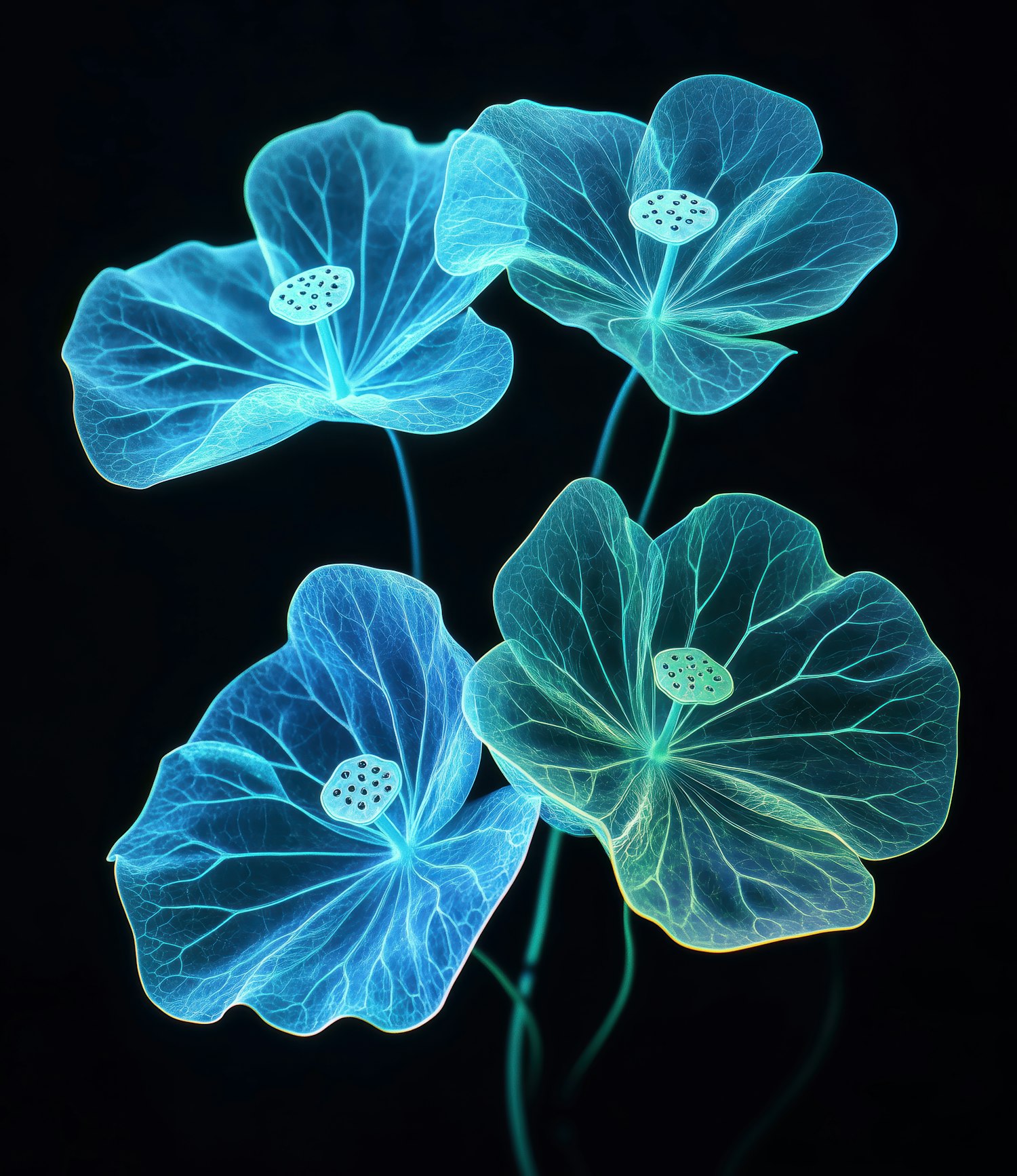 Glowing blue and green flowers with intricate veins against a dark background, creating a surreal and captivating visual effect.