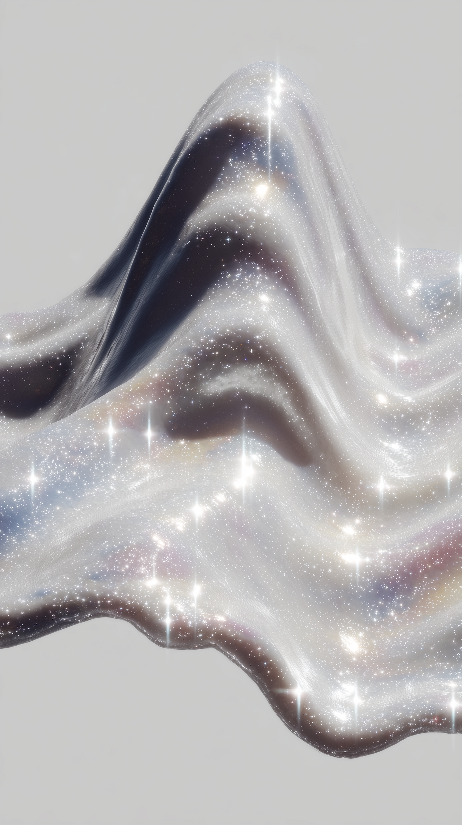 A shimmering, abstract wave-like form with starry sparkles on a neutral background, evoking a celestial and ethereal aesthetic.