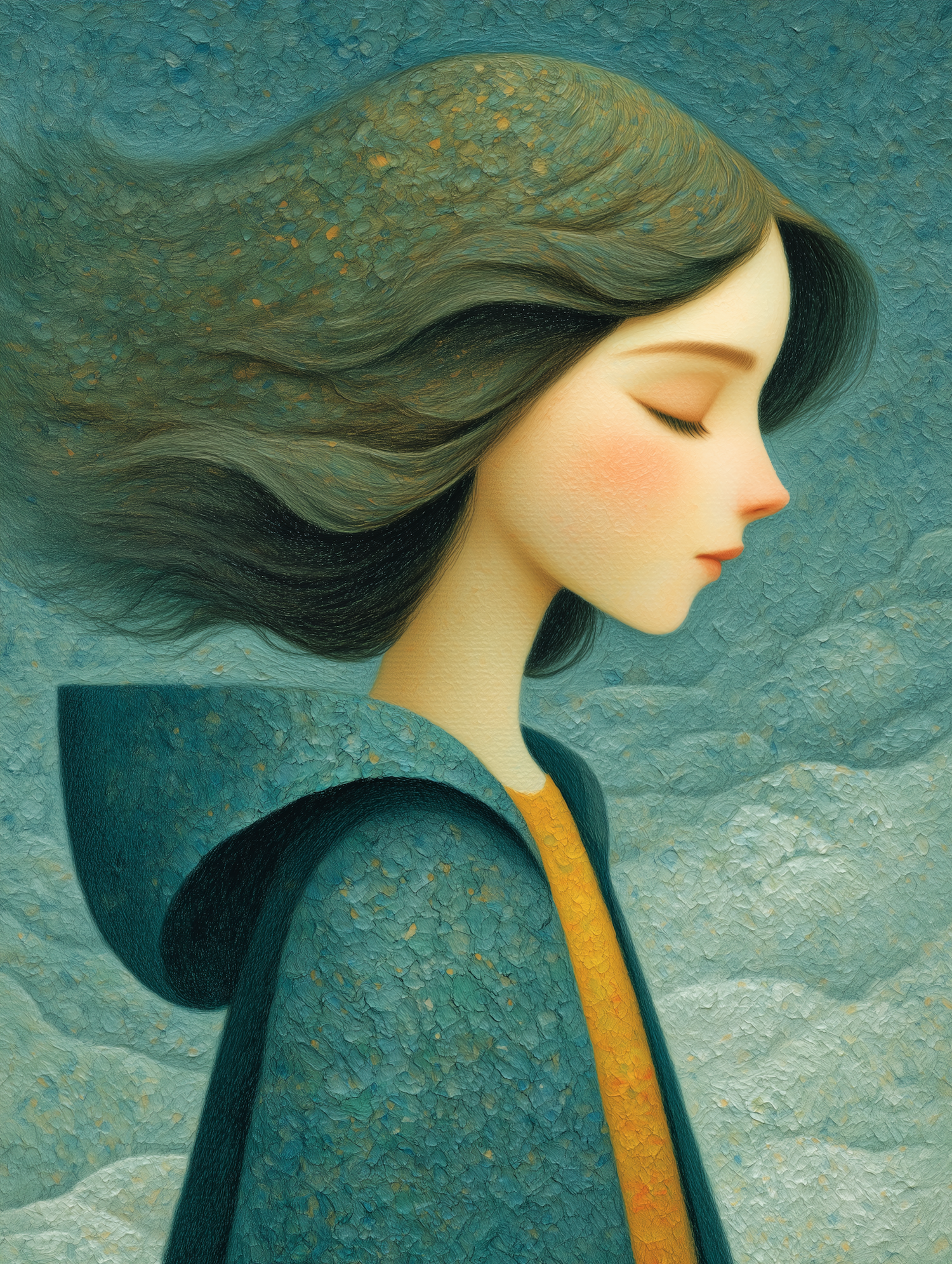 A dreamy illustration of a serene woman in a teal cloak, her hair flowing gently against a textured blue-green background.