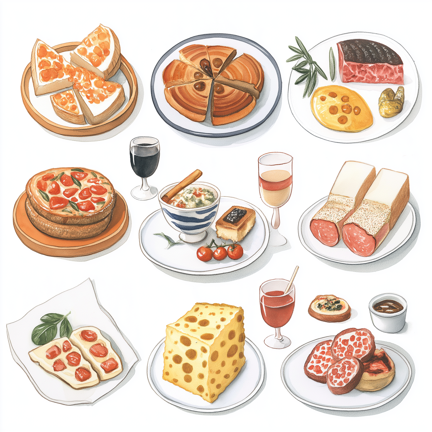 Illustration of European dishes like cheesecake, focaccia, risotto, salami, and Swiss cheese paired with wine. Perfect for food lovers!