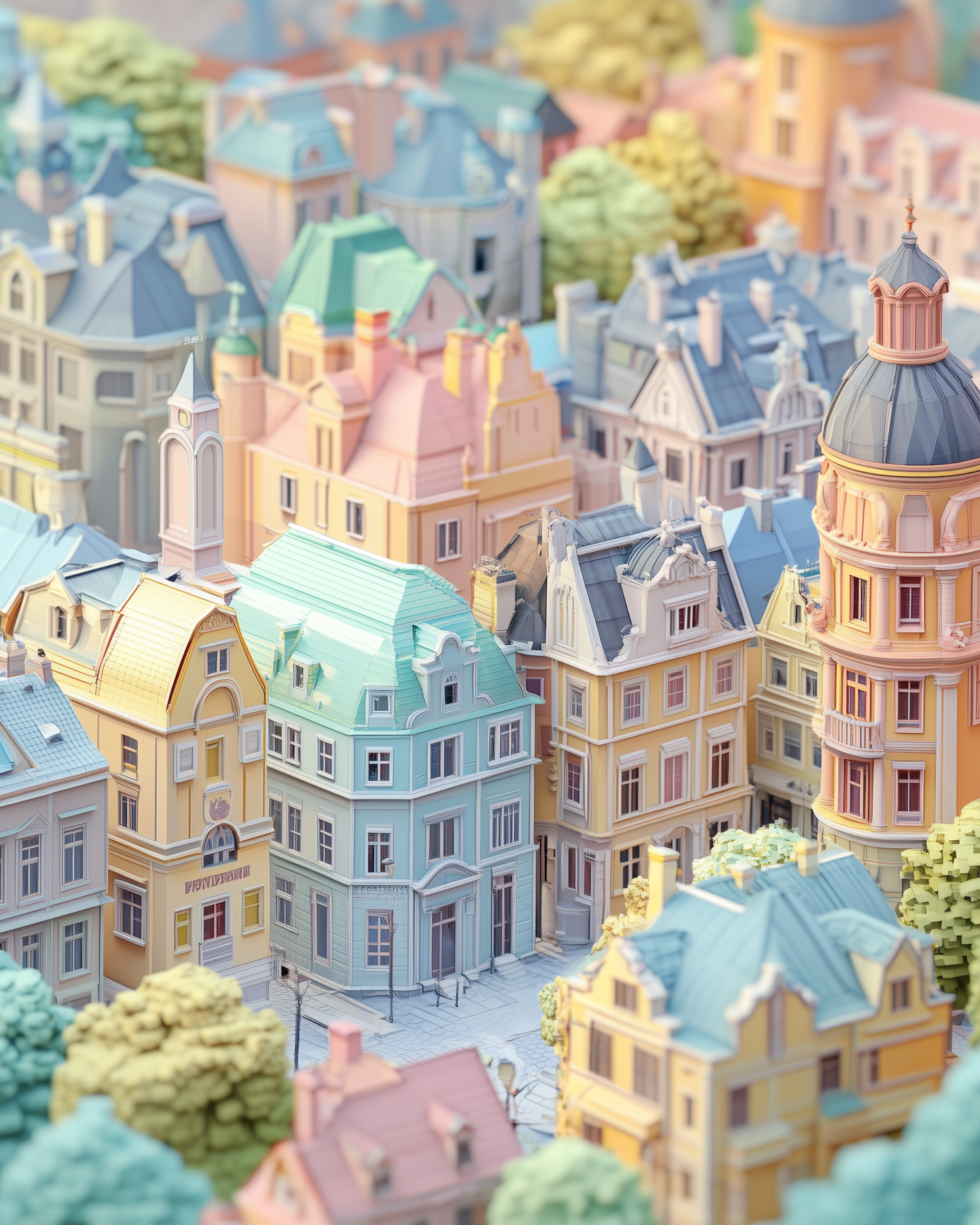 Charming pastel-colored European-style town with intricate architecture and lush greenery, creating a whimsical and dreamy vibe.