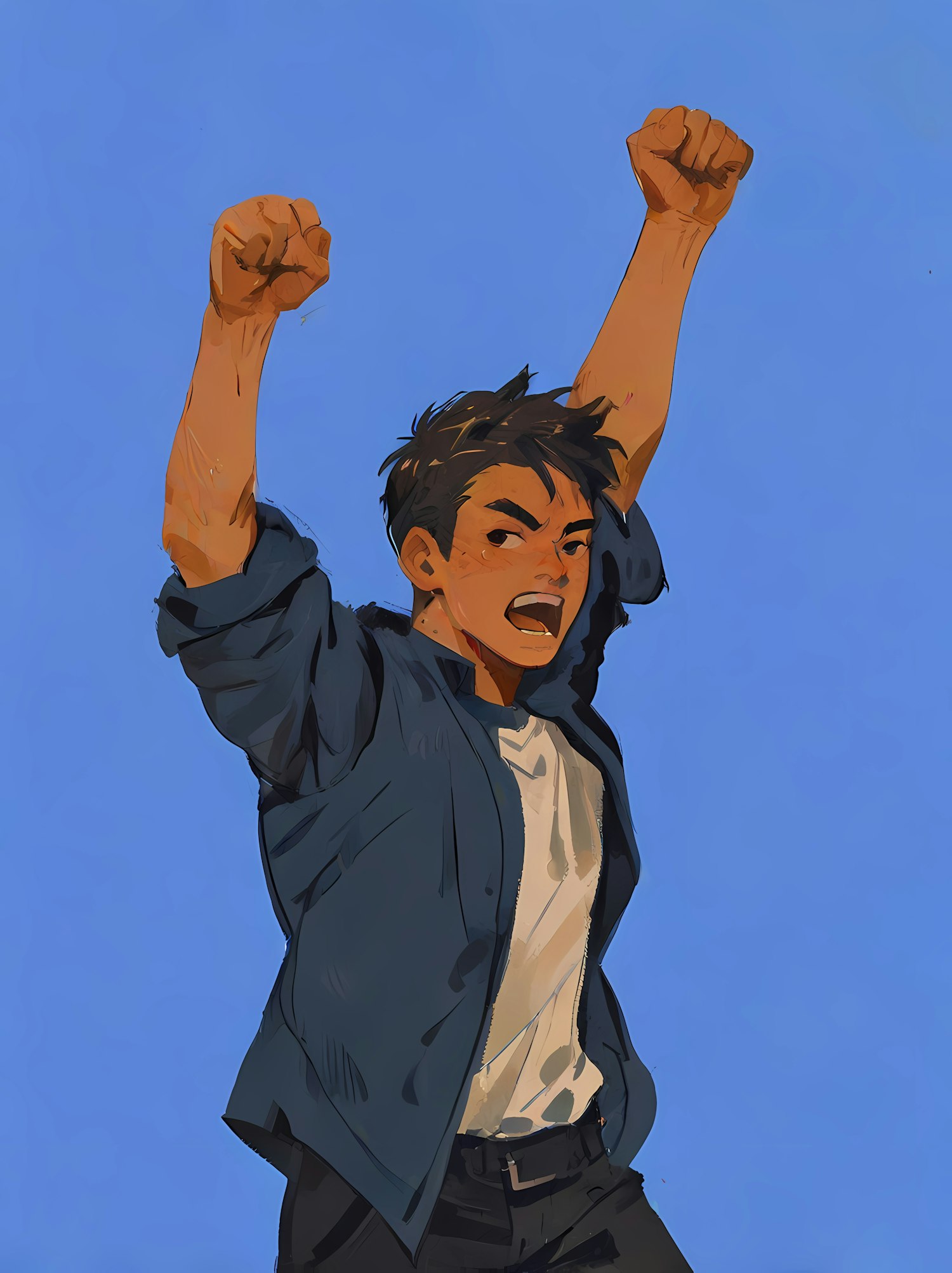An illustration of a young man enthusiastically raising his fists against a vibrant blue backdrop.