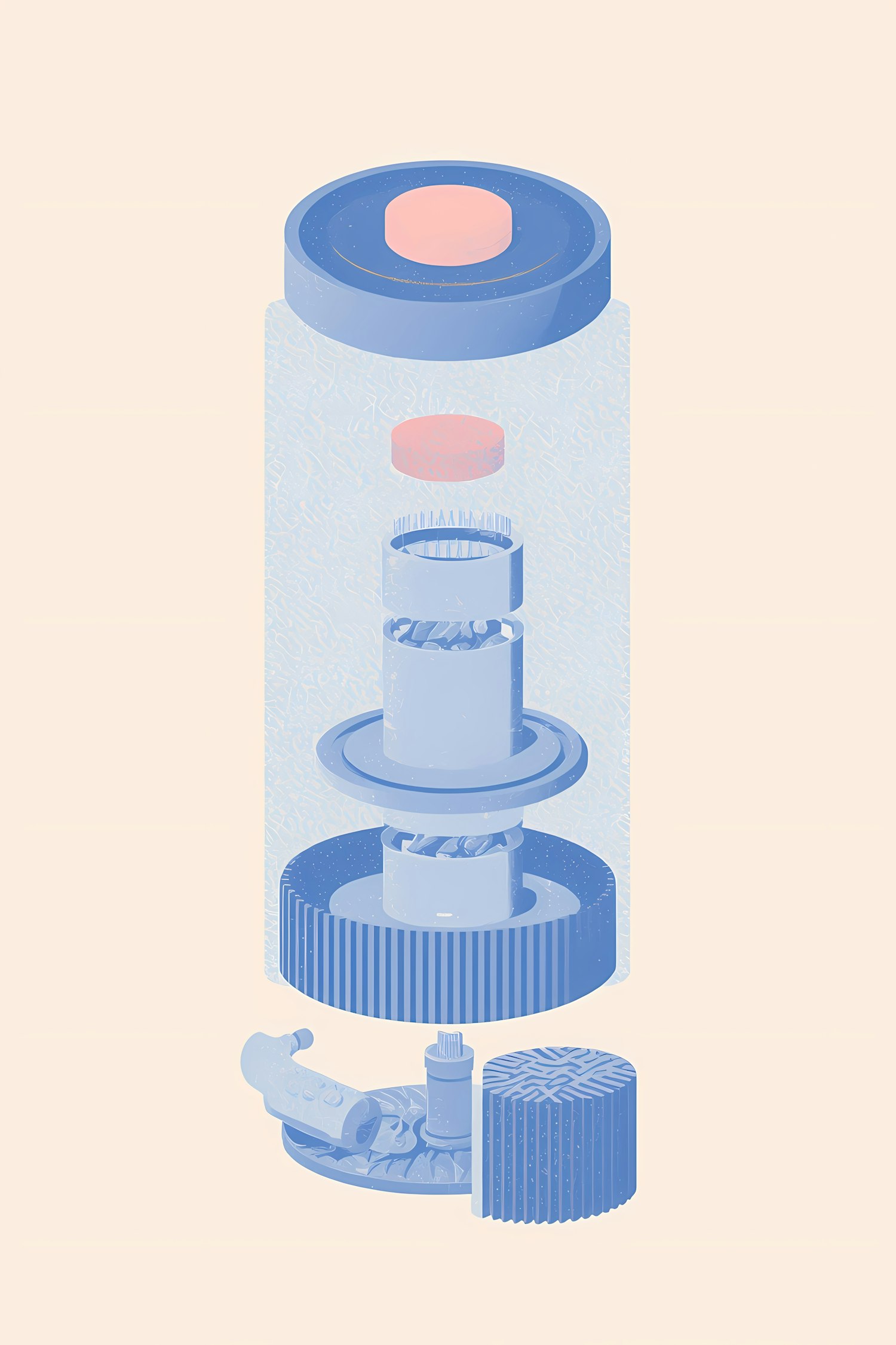 Stylized exploded view of a mechanical component in pastel colors, showcasing its internal structure with a clean, modern aesthetic.