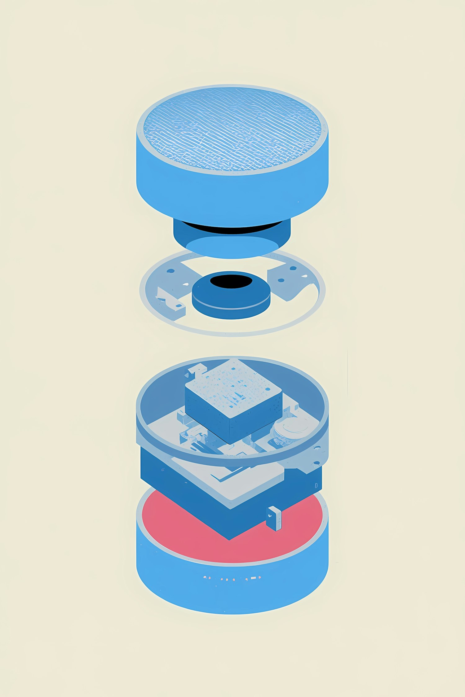 Exploded view of a cylindrical electronic device in blue and red tones, showcasing its internal components on a light beige background.