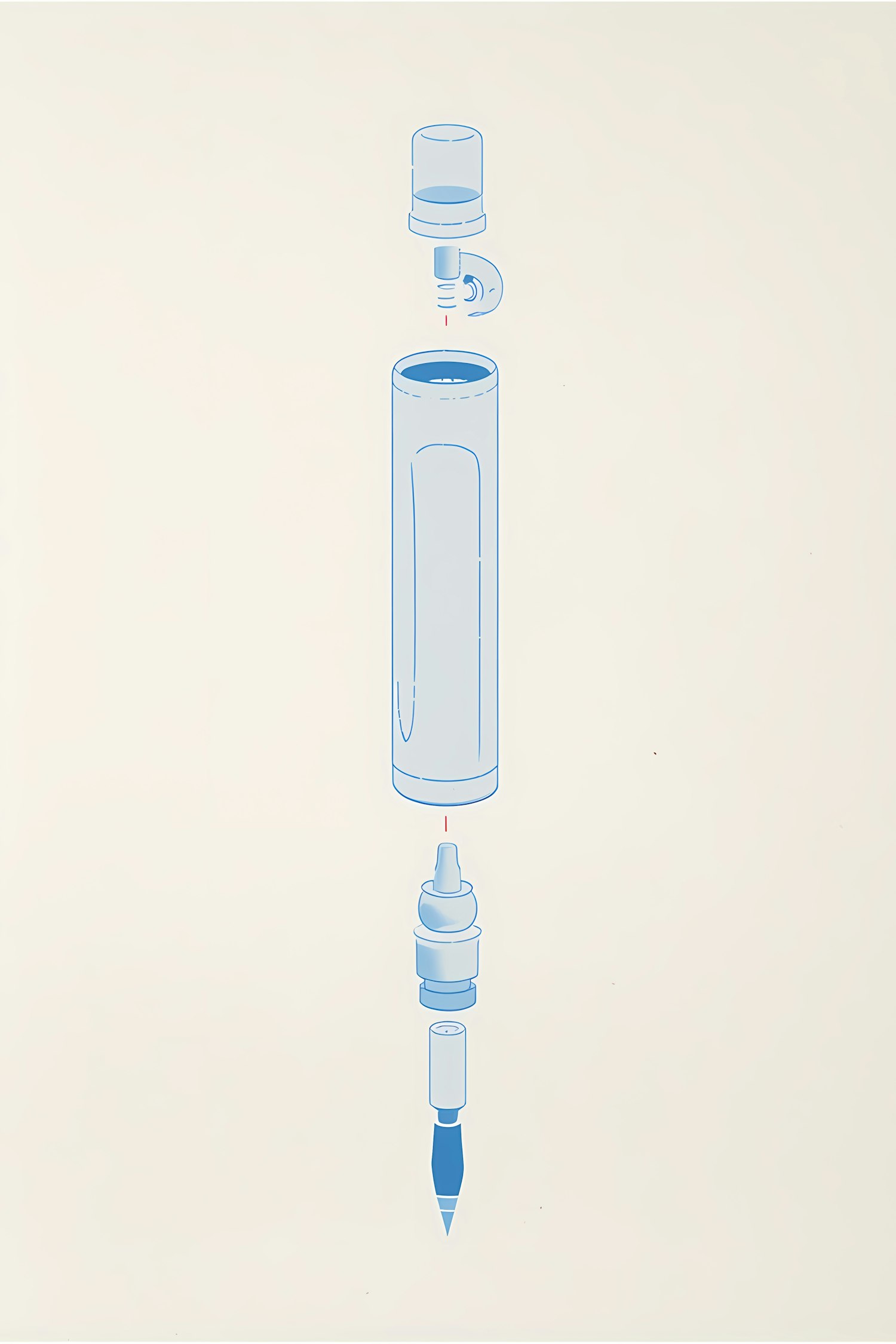 Exploded view of a pen or marker, showing its components in a clean, minimalistic illustration with light blue outlines on an off-white background.