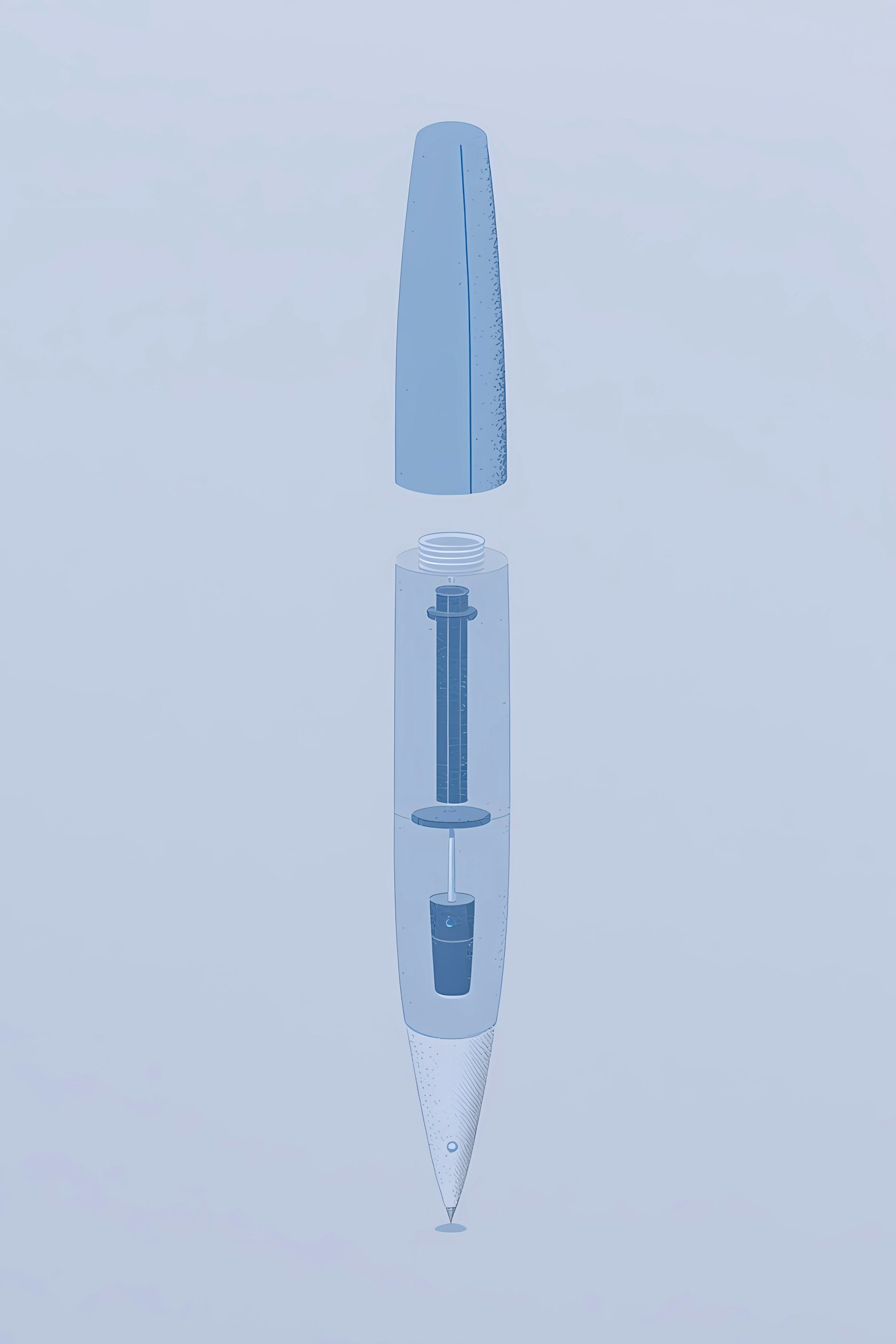 Exploded view of a pen in a clean, minimalistic blue illustration, showcasing its internal components and design.