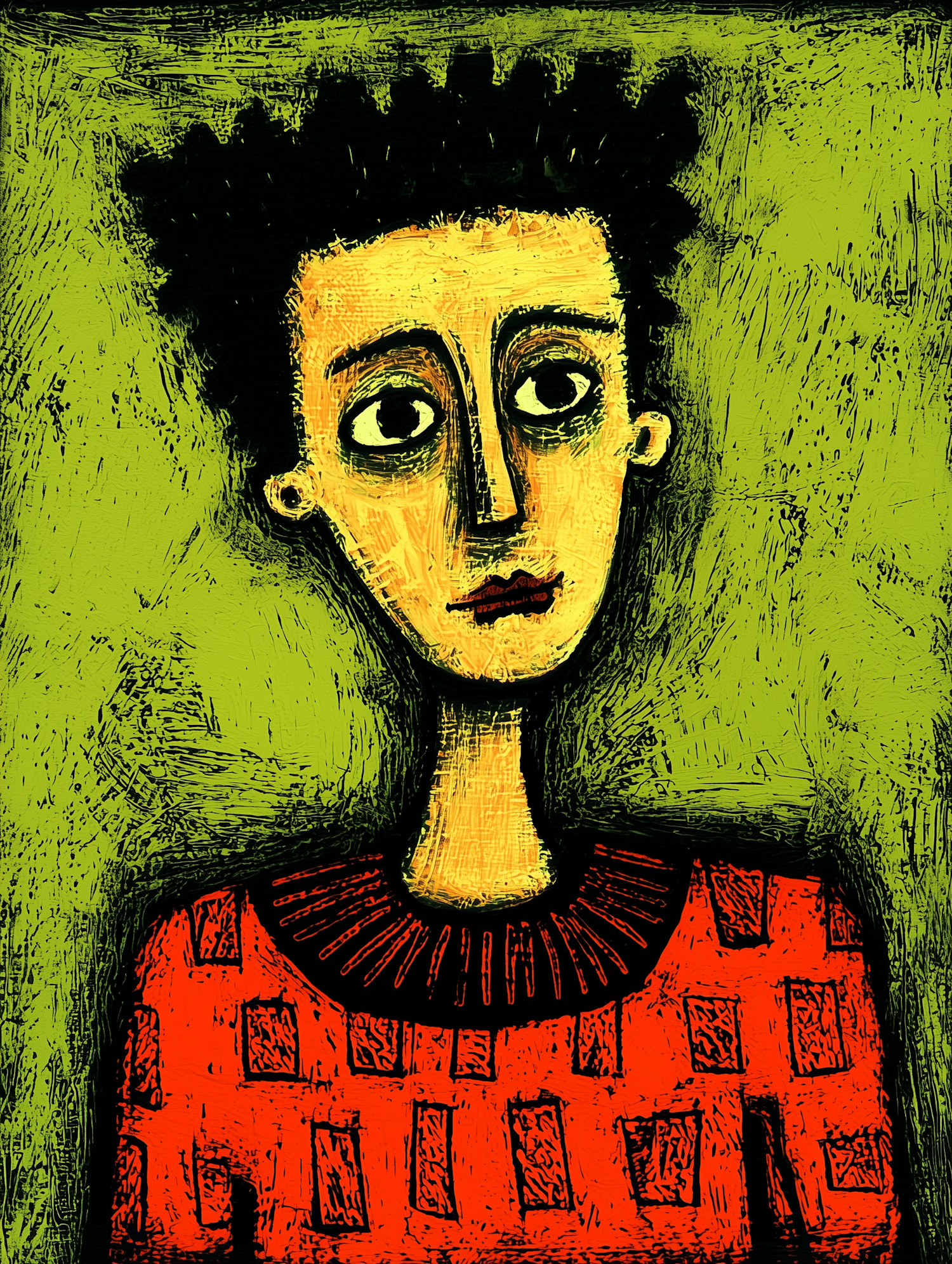 Expressionist illustration of a person with large eyes, spiky hair, and a red patterned sweater against a green background.