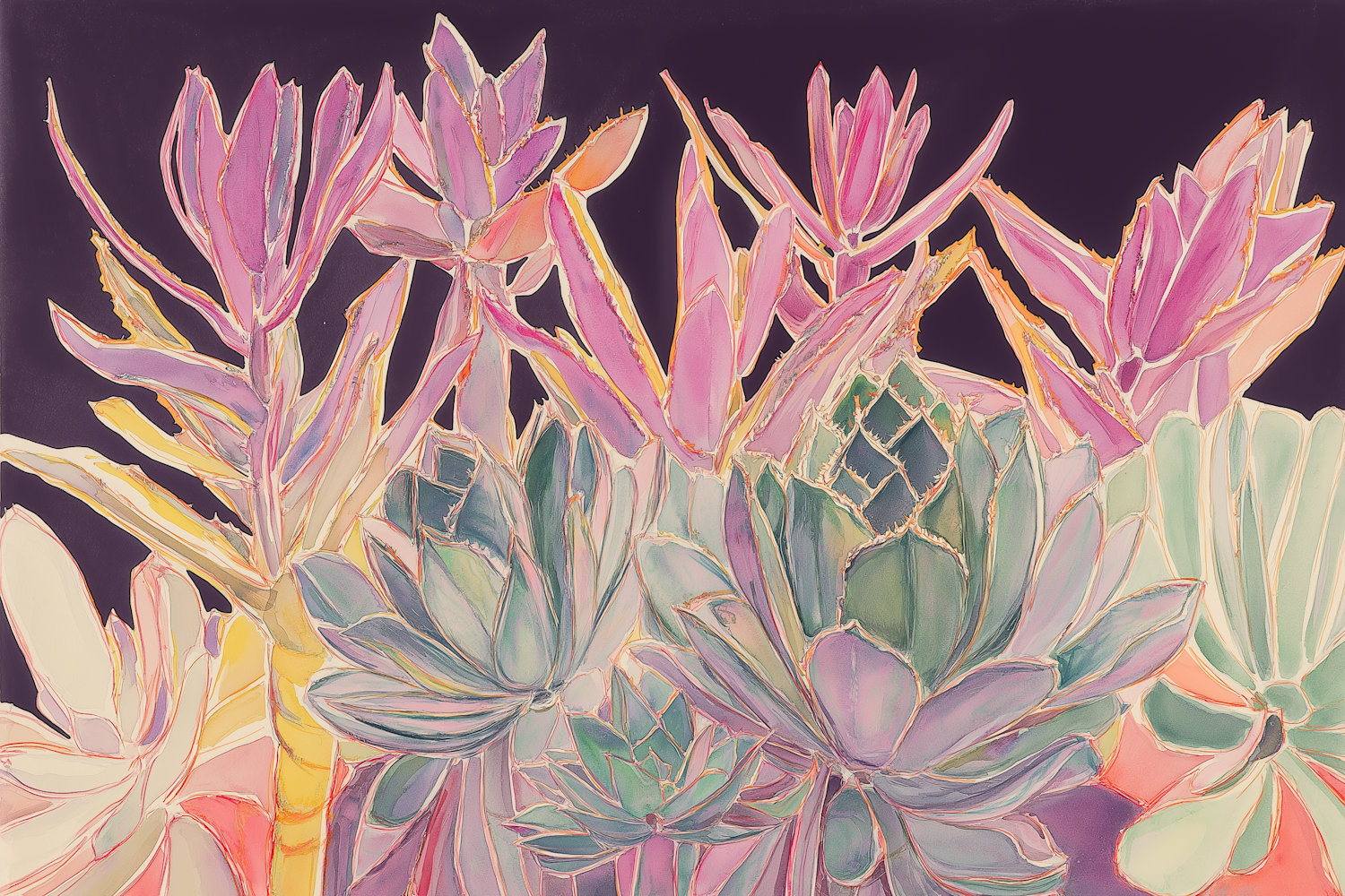 Vibrant illustration of colorful succulents with pink, purple, and green hues against a dark background.