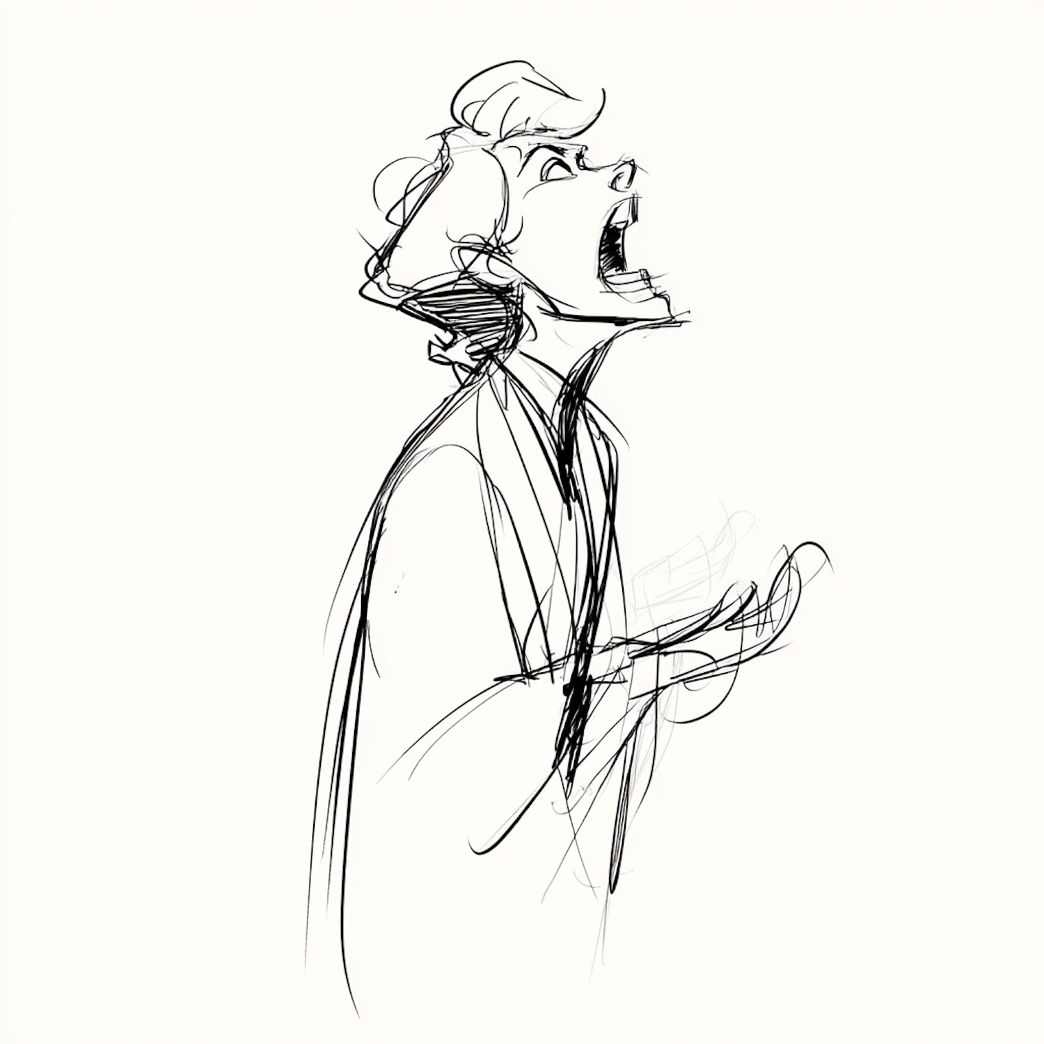 Black ink sketch of a character in expressive anguish, head tilted upward, mouth open, and hands gesturing in frustration.