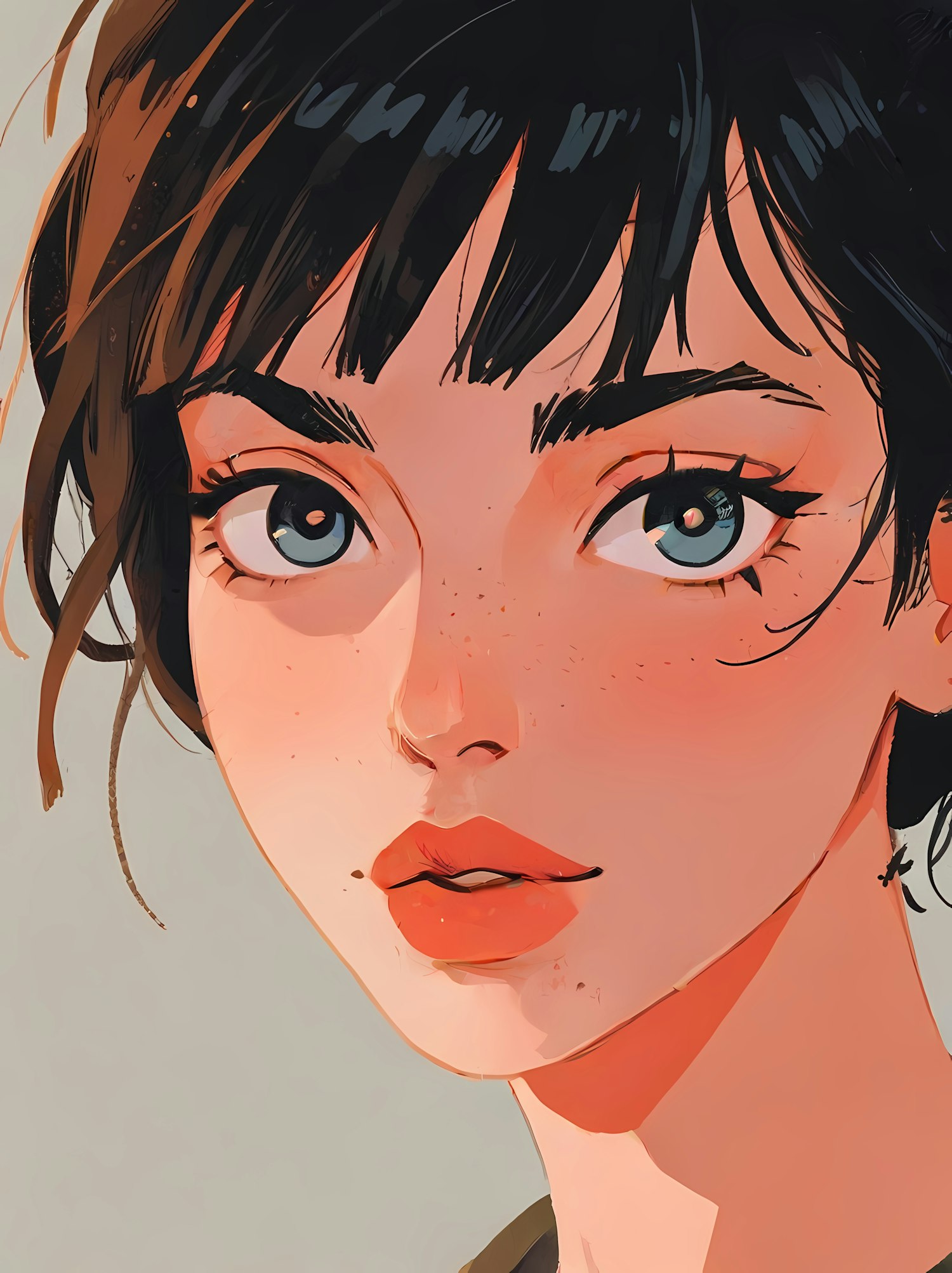 Digital illustration of a young woman with blue eyes, dark hair, and freckles. Modern, stylized portrait with warm tones and soft coral lips.