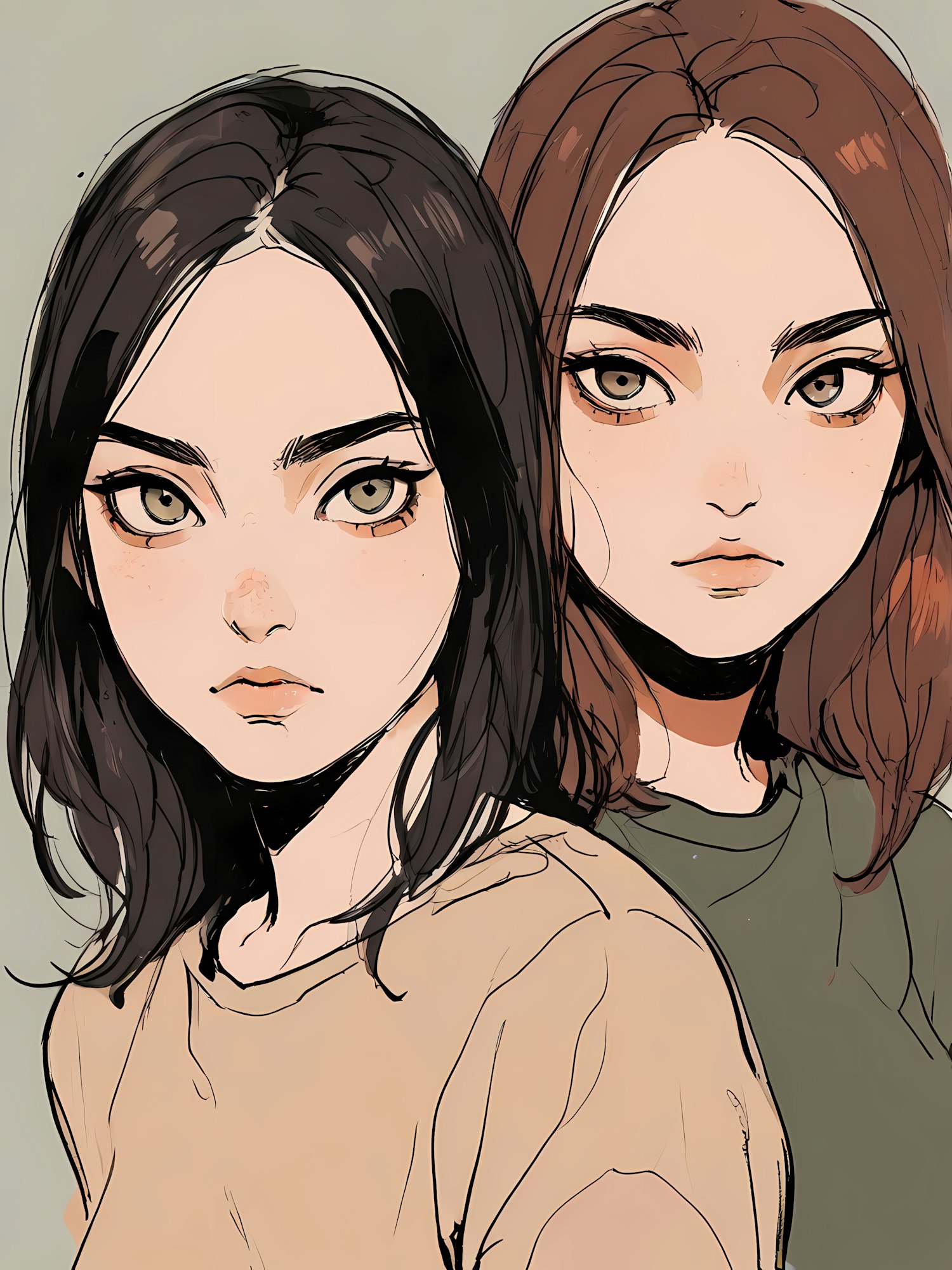 Stylized illustration of two young women with expressive eyes, one with black hair and beige shirt, the other with brown hair and green shirt.