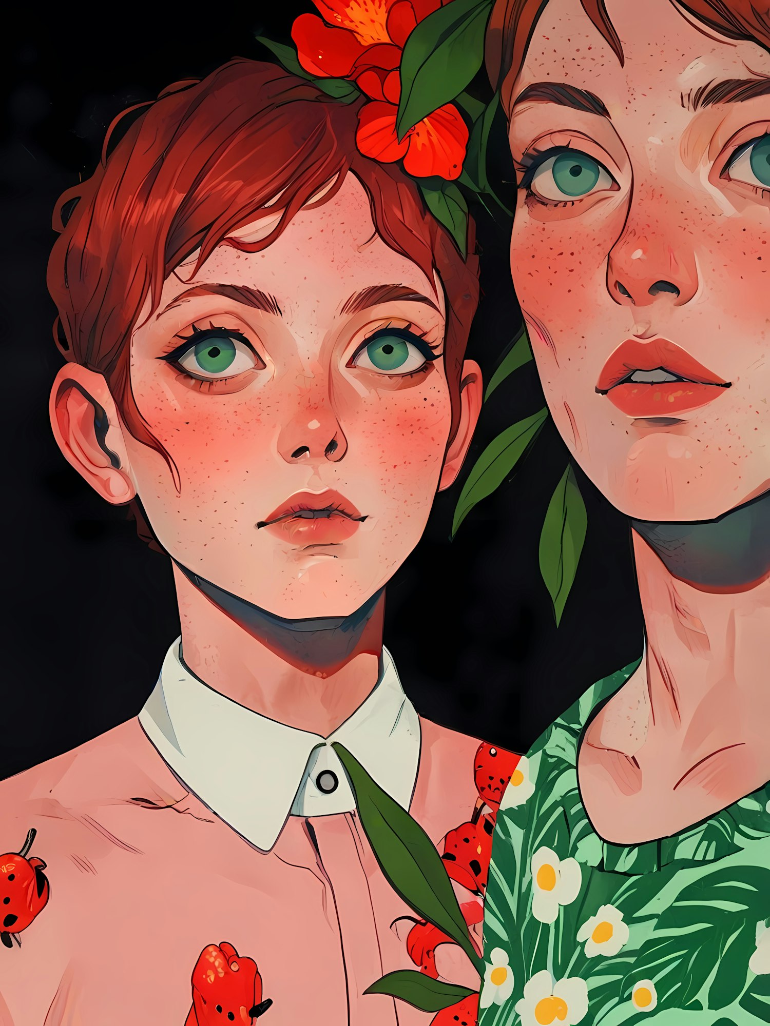 Vibrant illustration of two freckled women with red hair, adorned with flowers and ladybugs, set against a dark background.