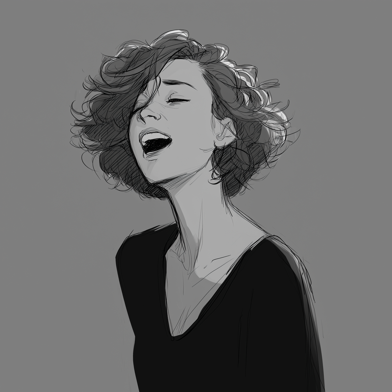Expressive sketch of a person with short curly hair, head tilted back, and mouth open, evoking a sense of joy or passion.