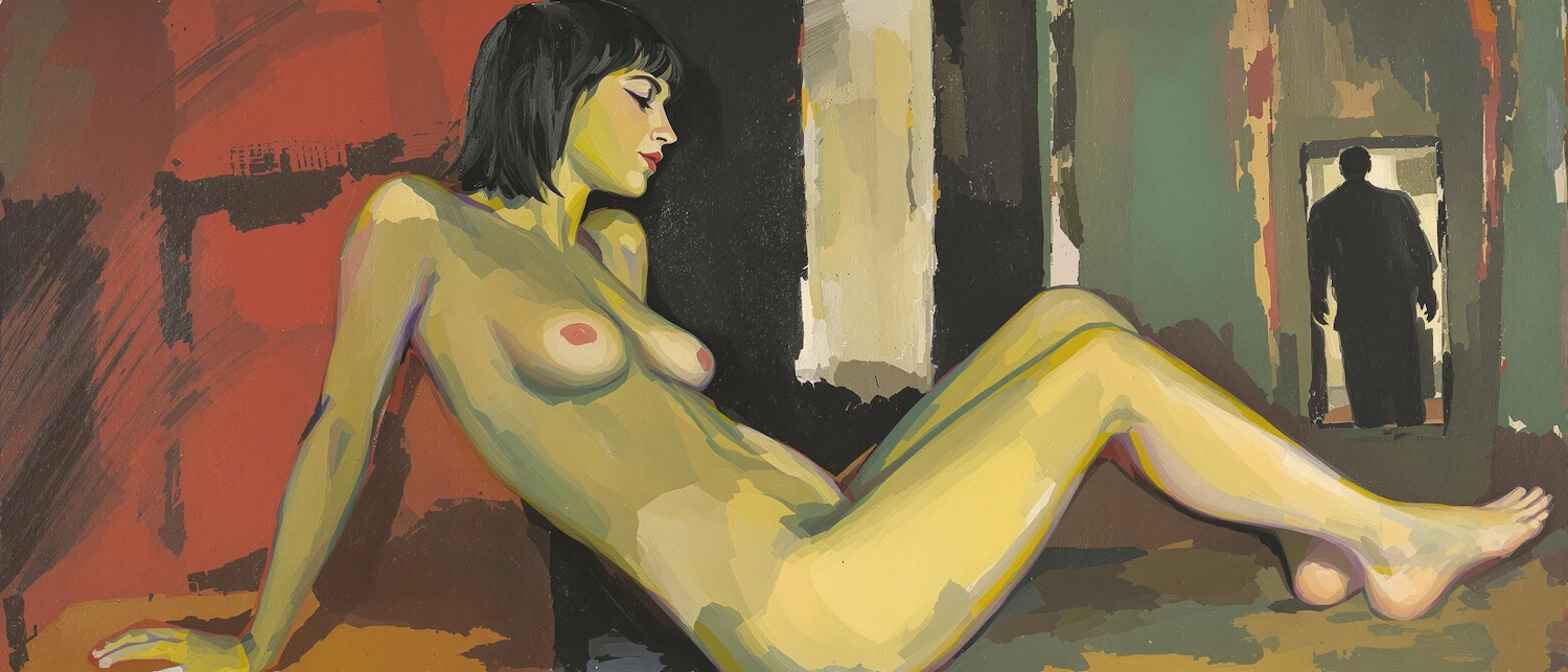 Expressive painting of a nude woman in a contemplative pose, with a shadowy figure in the background adding intrigue and mystery.