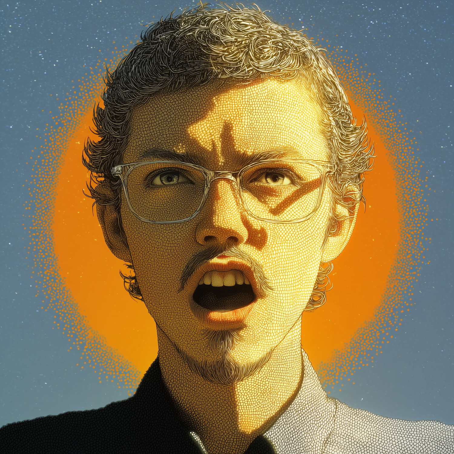 Stylized portrait of a surprised individual with glasses, set against a vibrant blue and orange gradient background.