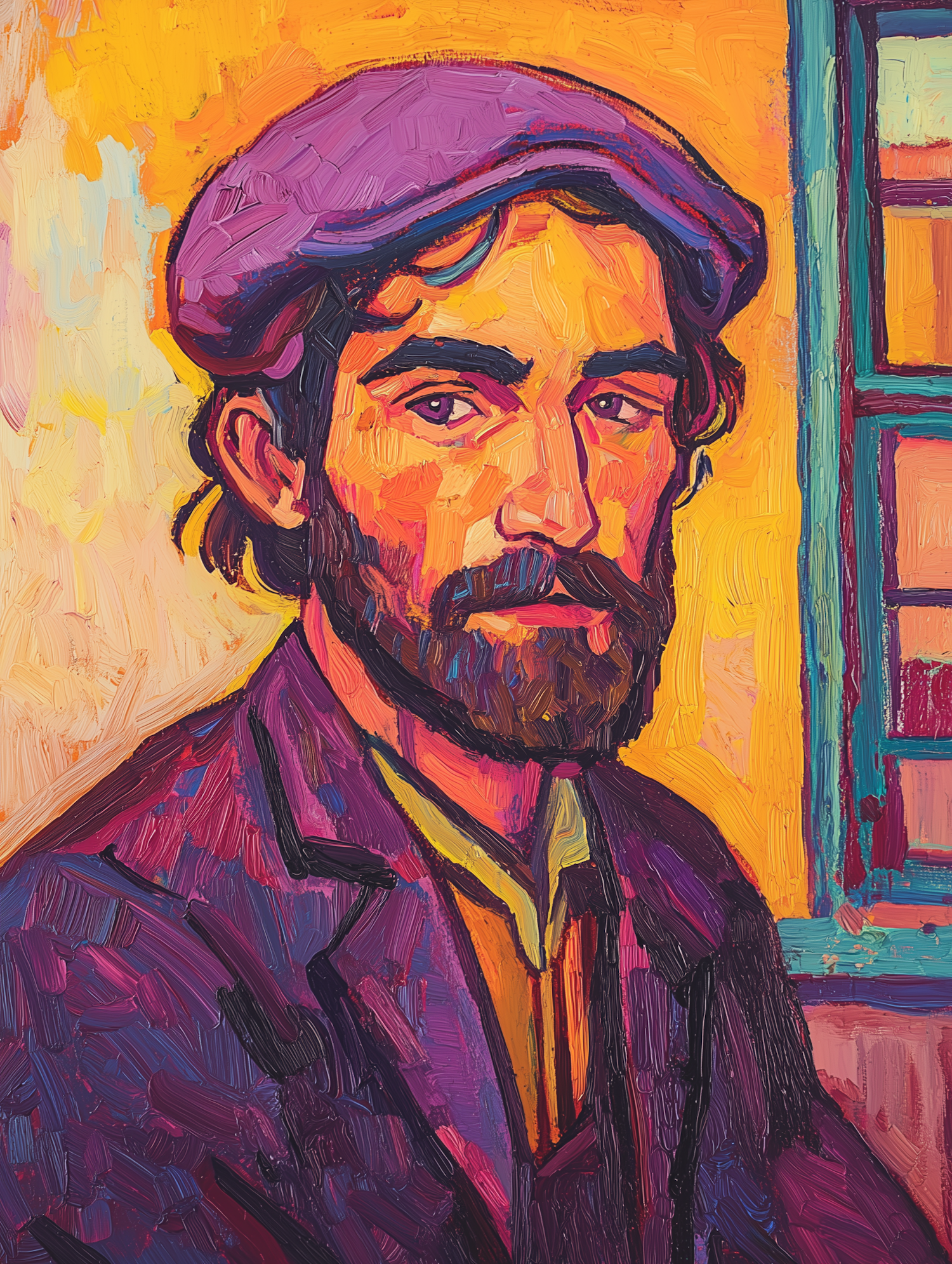 Vibrant painting of a bearded man in a purple cap, with bold brushstrokes and warm colors, set against an orange and yellow background.