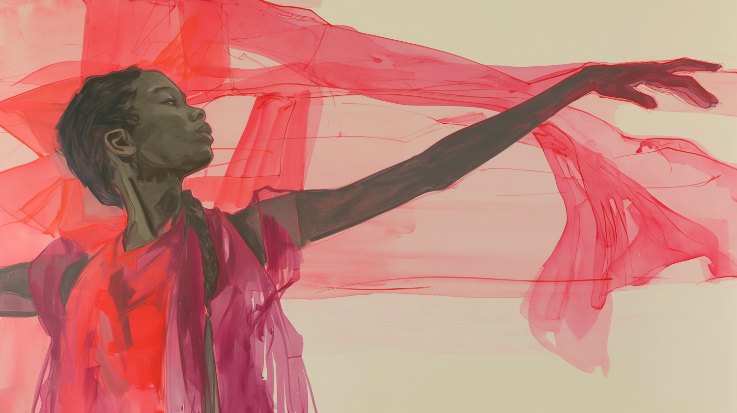 Elegant illustration of a woman in flowing red fabric, exuding grace and serenity with dynamic motion and vibrant colors.