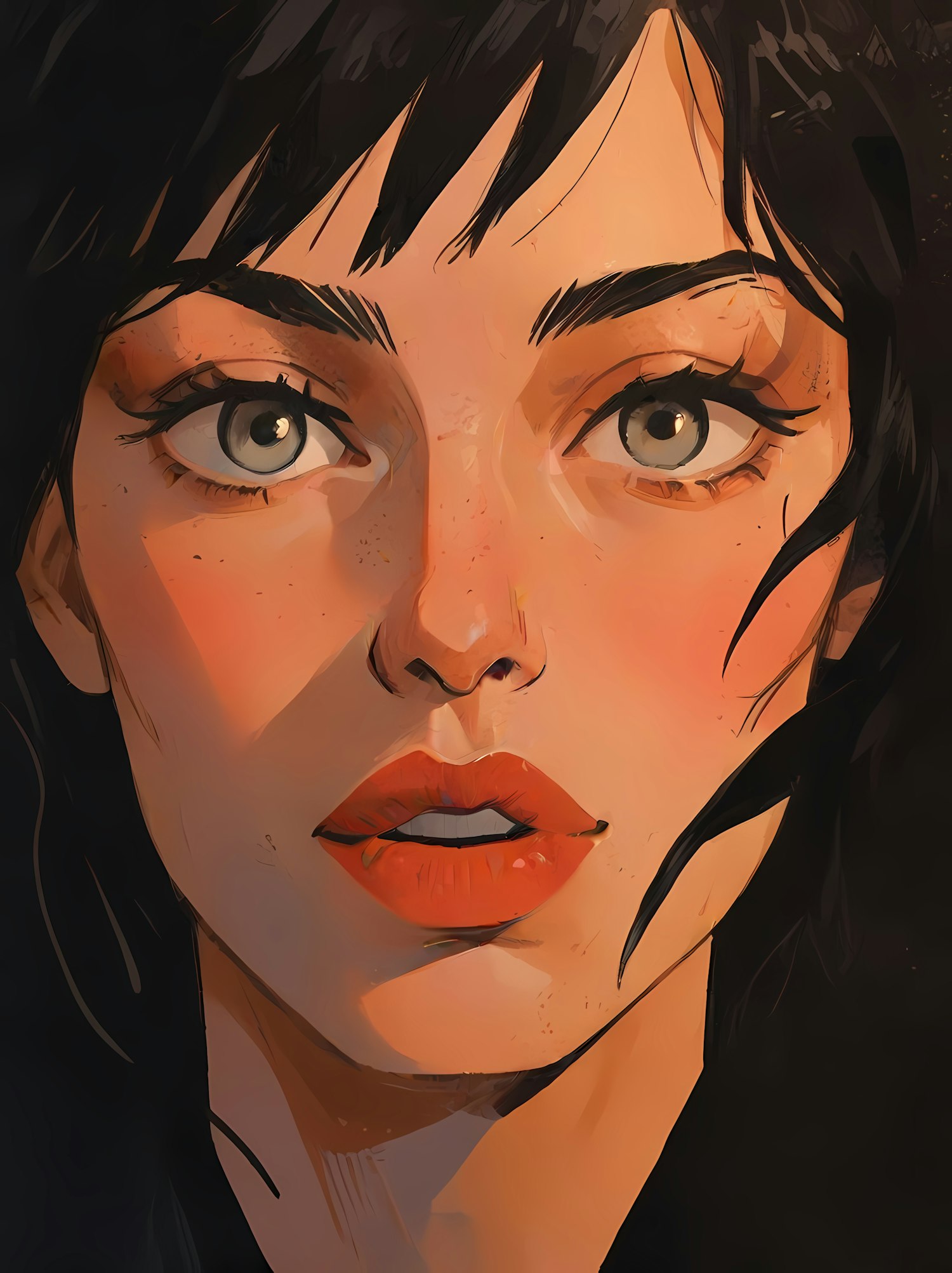 Captivating illustration of a woman with gray eyes, red lips, and black hair, set against a dark background.