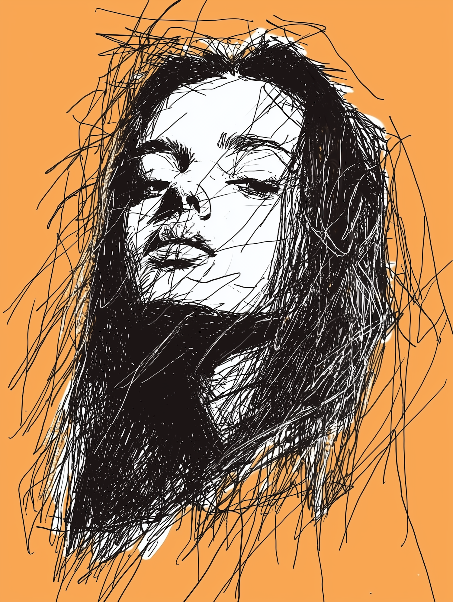 Abstract illustration of a woman's face with bold lines on an orange background, conveying emotion and movement.