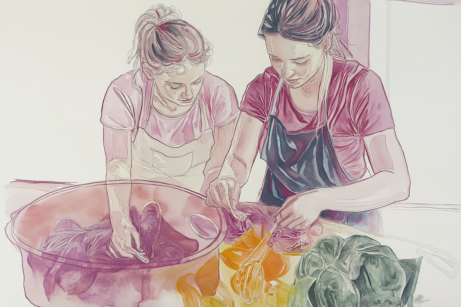 Two women dyeing fabric with vibrant colors, wearing aprons and focused on their creative task.