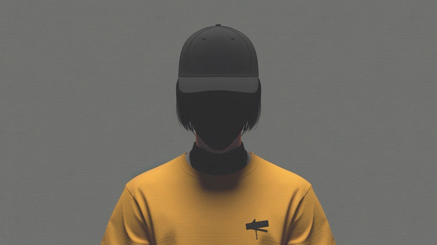 Mysterious faceless figure in a black cap and yellow shirt against a gray background, emphasizing anonymity and contrast.