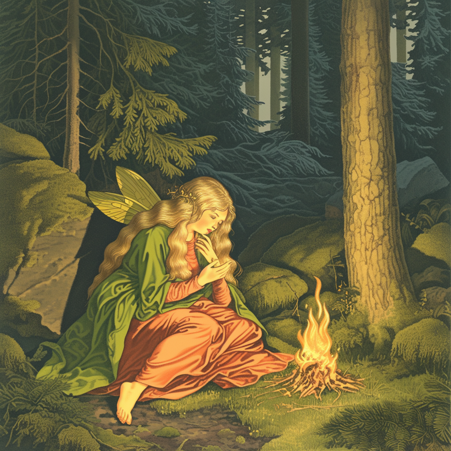A fairy-like woman with golden wings sits by a glowing campfire in a mystical forest, surrounded by tall trees and mossy rocks.