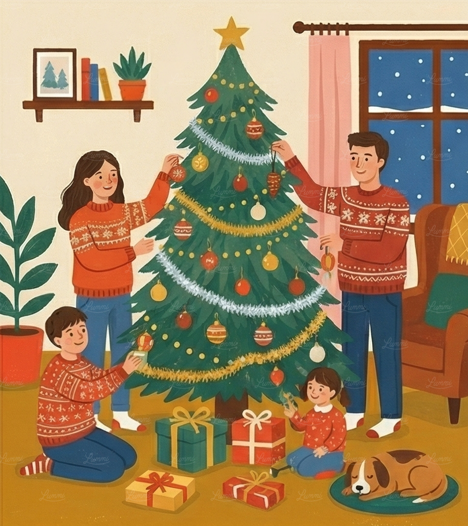 A family decorates a Christmas tree in a cozy living room, surrounded by gifts and festive decor, with a dog resting nearby.